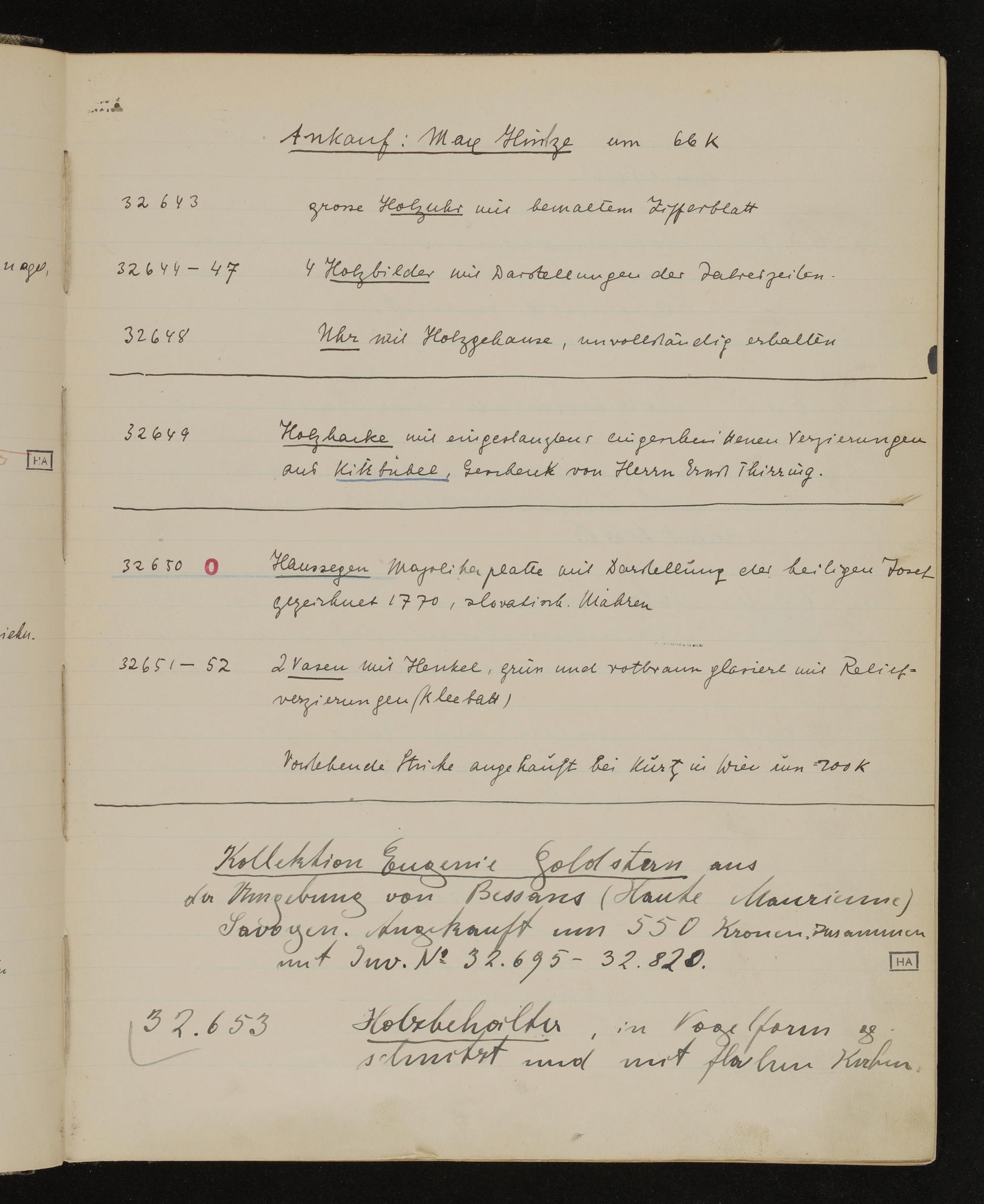 Inventarbuch Objektsammlung Erste Reihe, Band 10. Inventarnummern ÖMV 32.400-34.261