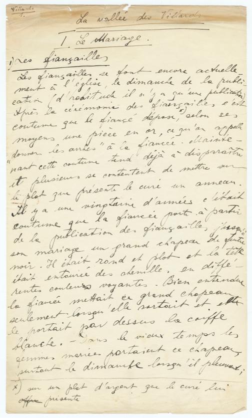 Villards 1.La vallée des VillardsI. Le Mariage.1. Les fiançaillesles fiançailles se font encore actuelle-ment à l'église, le dimanche de la publi-cation (d'habitude il n'y a qu'une publication).Après la cérémonie des fiançailles, c'estcoutume que le fiancé dépose, selon sesmoyens une pièce en or, ce qu'on appelle"donner les arrhes" à la fiancée. Mainte-nant cette coutume tend déjà à disparaîtreet plusieurs se contentent de mettre surle plat que présente le curé un anneau.Il y a une vingtaine d'années c'étaitcoutume que la fiancé porte à partirde la publication des fiançailles, jusqu'àson mariage un grand chapeau de feutrenoir. Il était rond et plat et la têteétait entourée de chenilles, en diffé-rentes couleurs voyantes. Bien entendula fiancée mettait ce grand chapeauseulement quand elle sortait et ellele portait par dessus la coiffeblanche. Dans le vieux temps lesfemmes mariées portaient ce chapeausurtout le dimanche lorsqu'il pleuvait;x) sur un plat d'argent que le curé lui offre présente