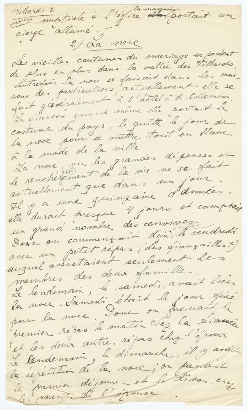 Villards 3mariagenuptiale à l'église elle la marraine portait uncierge allumé. -La noceLes vielles coutumes du mariage se perdentde plus en plus dans la vallée des Villards.Autrefois la noce se faisait dans les mai-sons des particuliers, actuellement elle sefait généralement à l'hôtel à St Collomban.La fiancée quand même elle portait lecostume du pays, le quirre le jour dela noce pour se mettre tout en blanc,à la mode de la ville.La noce, avec les grandes dépenses etle renchérissement de la vie ne se faitactuellement que dans un jour.Il y a une quinzaine d'années,elle durait presque 4 jours et comptaitun grand nombre de convives.Donc on commençait d'habitude déjà le vendrediavec un petit repas (des fiançailles)auquel assistaient seulement lesmembres des deux familles.Le lendemain, le samedi, avait lieula noce. Samedi était le jour fixépour la noce. Donc on prenait lepremier repas le matin chez la fiancéeet les deux autres repas chez l'époux.Le lendemain, le dimanche, il y avaitla répétition de la noce; on prenaitle premier déjeuner et le dîner chezles parents de l'épouse.
