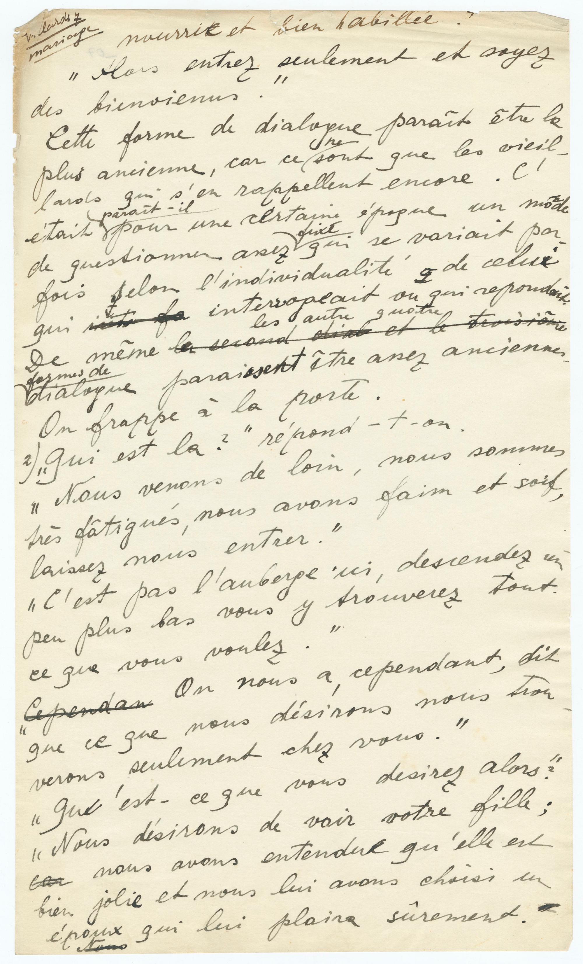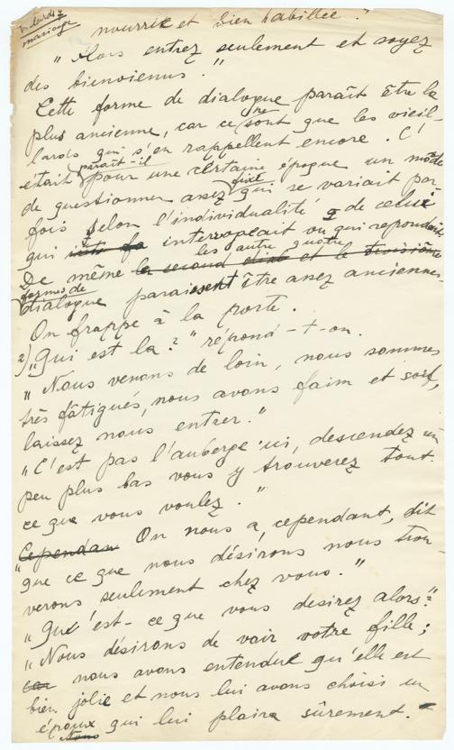Villards 7mariagenourrie et bien habillée.""Alors entrez seulement et soyezdes bienvenus."Cette forme de dialogue paraît être laplus ancienne, car ce ne sont que les vieil-lards qui s'en rappellent encore. C'était paraît-il pour une certaine époque un modede questionner assez fixé, qui variait par-fois selon l'individualité de celuiqui fa interrogeait ou qui répondait.De même la second et le tevi les autres quatreformes de dialogue paraissent être assez anciennes.On frappe à la porte.2) "Qui est là", répond-t-on."Nous venons de loin, nous sommestrès fatigués, nous avons faim et soif,laissez nous entrer.""C'est pas une aubeerge ici, descendez unpeu plus bas vous y trouverez toutce que vous voulez.""Cependan On nous a cependant ditque ce que nous désirons nous le trou-verons seulement cehz vous.""Qu'est-ce que vous désirez alors?""Nous désirons voir votre fille;ea nous avons entendu qu'elle estbien jolie et nous lui avons choisi unépoux qui lui plaira sûrement."