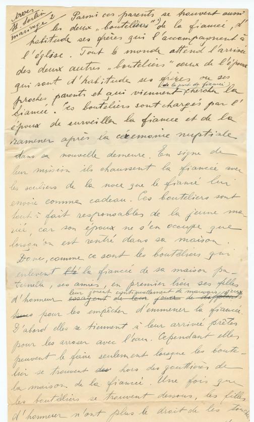 ArvesSt. Sorlinmariage 2Parmi ces parents se trouvent aussides deux autres"bouteliers" [recte: bouteillers] de la fiancée, d'habitude ses frères qui l'accompagnent àl'église. Tout le monde attend l'arrivéeles deux autres "bouteillers" ceux de l'épouxqui sont d'habitude ses frères ou sesproches parents et qui viennent de la part du fiancé chercher lafiancée. Les bouteillers sont chargés par l'époux de surveiller la fiancée et de laramener après la cérémonie nuptialedans sa nouvelle demeure. En signe deleur mission ils chaussent la fiancée avecles souliers de la noce que le fiancé luienvoie comme cadeau.“ Ces bouteillers sonttout à fait responsables de la jeune ma-riée, car son époux ne s'en occupe quelorsqu'on est rentré dans sa maison.Donc, comme ce sont les bouteillers quienleventla fiancée de sa maison pa-ternelle, ses amies, en premier lieu ses fillesd'honneur essayent de leur joeur de differents leur jouent continuellement de mauvais jeuxpour les empêcher d'emmener la fiançée.D'abord elles se tiennent à leur arrivée prêtesArves pour les arroser avec l'eau. Cependant ellespeuvent le faire seulement lorsque les bouteil-lers se trouvent hors des gouttières dela maison de la fiancée. Une fois queles bouteillers se trouvent dessous, les fillesd'honneur n'ont plus le droit de les toucher.