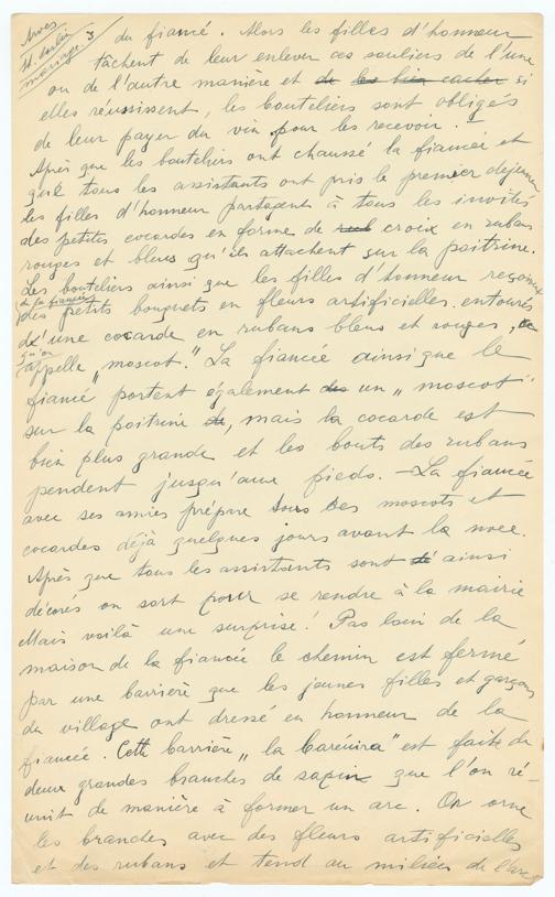 ArvesSt. Sorlinmariage 3du fiancé. Alors les filles d’honneurtâchent de leur enlever ces souliers de l'uneou de l'autre manière et de les bien cacher sielles réussissent, les bouteillers sont obligésde leur payer du vin pour les recevoir. -Après que les bouteillers ont chaussé la fiancée etque tous les assistants ont pris le premier déjeunerles filles d'honneur partagent à tous les invitésdes petites cocardes en forme de rue croix en rubanrouges et bleus qu'ils attachent sur la poitrine.Les bouteillers ainsi que les filles d'honneur reçoiventde la fiancée des petits bouquets en fleurs artificielles, entourésd'une cocarde en rubans bleus et rouges, cequ'on appelle, moscot. La fiancée ainsi que lefiancé portent également des un"moscot"sur la poitrine de, mais la cocarde estbien plus grande et les bouts des rubanspendent jusqu'aux pieds. La fiancéeavec ses amies prépare tous les moscots etcocardes déjà quelques jours avant la noce.Après que tous les assistants sont d' ainsidécorés on sort pour se rendre à la mairie.Mais voilà une surprise! Pas loin de lamaison de la fiancée le chemin est fermépar une barrière que les jeunes filles et garçondu village ont dressé en honneur de lafiancée. Cette barrière la"Baréuira" est faite dedeux grandes branches de sapin que l'on réunit de manière à former un arc. On orneles branches avec des fleurs artificielleset des rubans et tend au milieu de l'arc