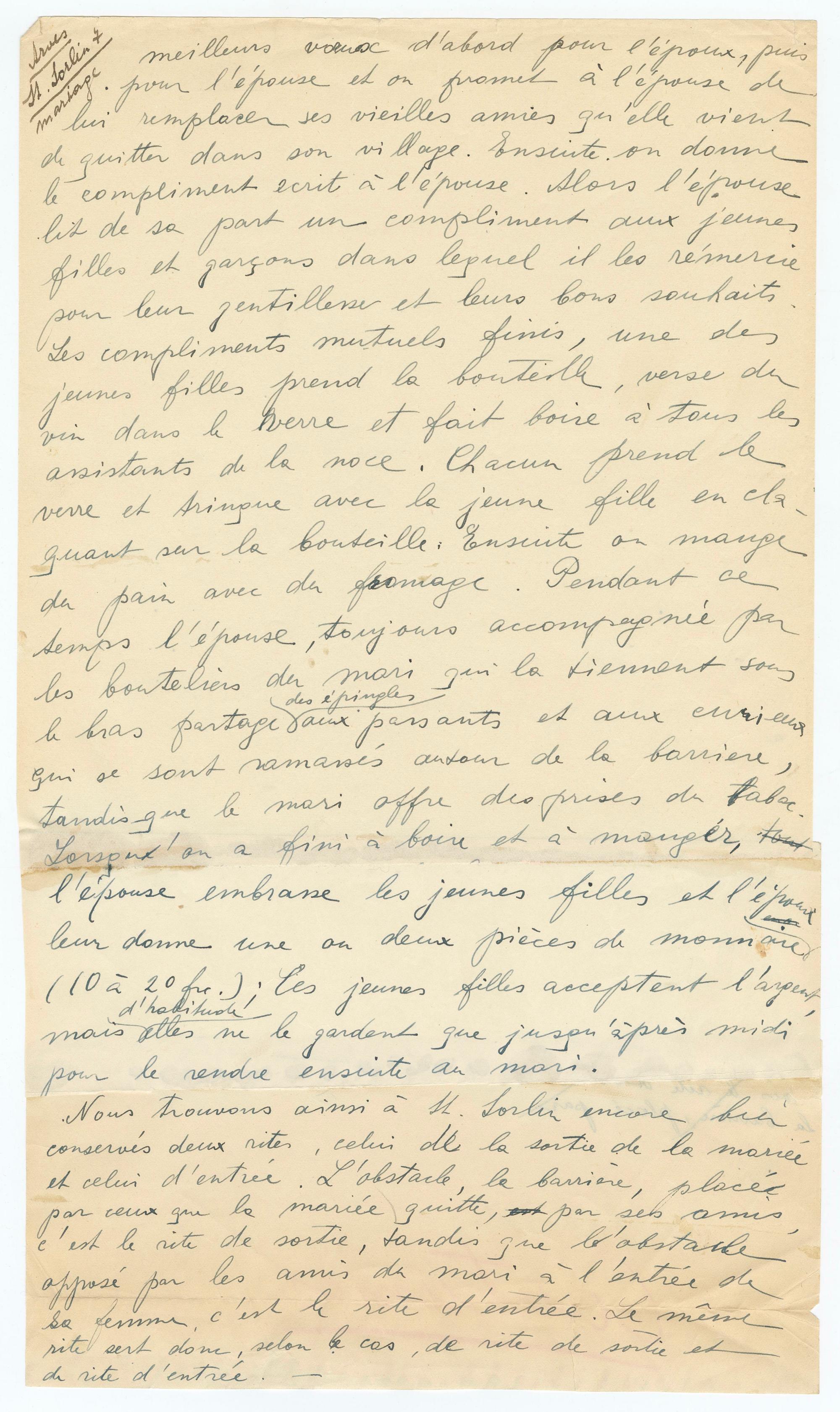 ArvesSt. Sorlin 7mariagemeilleurs vœux d'abord pour l'époux, puispour l'épouse et on promet à l'épouse delui remplacer ses vieilles amies qu’elle vientde quitter dans son village. Ensuite, on donnele compliment écrit à l'épouse. Alors l'épouxlit de sa part un compliment aux jeunesfilles et garçons dans lequel il les remerciepour leur gentillesse et leurs bons souhaits.Les compliments mutuels finis, une desjeunes filles prend la bouteille, verse duvin dans le verre et fait boire à tous lesassistants de ce noce. Chacun prend leverre et trinque avec la jeune fille en cla-quant sur la bouteille. Ensuite on mangedu pain avec du fromage. Pendant cetemps l'épouse, toujours accompagnée parles bouteillers du mari qui la tiennent sousle bras partage des épingles aux passants et aux curieuxqui se sont ramassés autour de la barrière,tandis que le mari offre des prises du tabac.Lorsqu'on a fini à boire et à manger, toutl'épouse embrasse les jeunes filles et l'épouxleur donne une ou deux pièces de monnaie(10 à 20 fr.); les jeunes filles acceptent l'argentmais d'habitude elles ne le gardent que jusqu'après midipour le rendre ensuite au mari.Nous trouvons ainsi à St. Sorlin encore bienconservés deux rites, celui de la sortie de la mariée.et celui d’entrée. L’obstacle, la barrière, placéepar ceux que la mariée quitte, par ses amis,c'est le rite de sortie, tandis que l’obstacleopposé par les amis du mari à l'entrée desa femme, c'est le rite d’entrée. Le mêmerite sert donc, selon le cas, de rite de sortie etde rite d'entrée.
