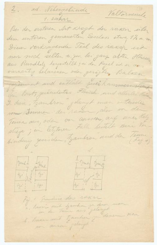 gezimmert und enthält zwei Kammern,für Brot, gereichertes Fleisch und allerlei HausentIn diese„zambron gelangt man entwedervom Inneren des raken, also von denTenne aus, oder von aussen, auf einer Holz-stiege; im letzteren Falle besteht keine undbindung zwischen"Tzambron" und der Tenne(Fig 1)