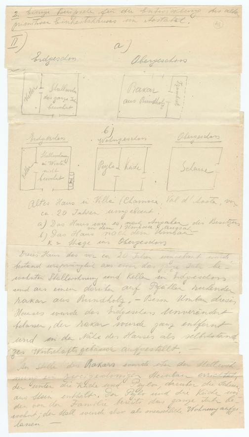 2.18Einige Beispiele für die Entwicklung des altenprimitiven Einheitshauses im Aostatal.II)a)ErdgeschossKellerStallwohn.dies ganze JahrbewohntObergeschossRakaraus RundholzTzambret