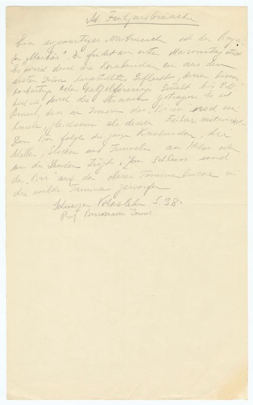 Ad. FrühjarsbräucheEin eigenartiger Maebrauch ist der Raya-zu"Maibär". Er findet an ersten Maisonntag stattEs wird durch die Knabenscha ein aus denersten seinen hergestelltes Geflecht, dessen bienenVorbartige v. Kelførninge bestalt bis 2 M,hoet ist, durch die Strassen getragen.Braut, dass er Innern des„Bären" noch ein