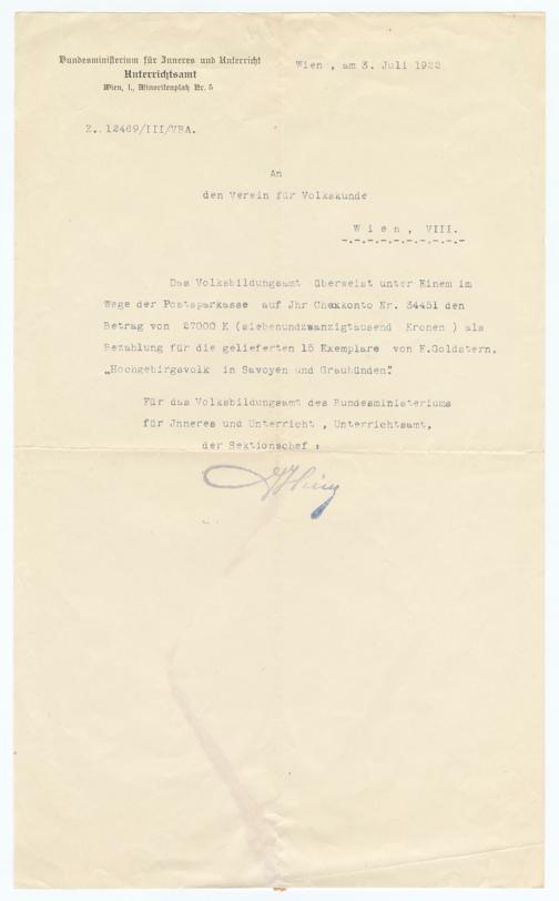 Wege der Postsparkasse auf Jhr Checkkonto Nr. 34451 denBetrag von 27000 K (siebenundzwanzigtausend Kronen) alsBezahlung für die gelieferten 15 Exemplare von E. Goldstern,,, Hochgebirgsvolk in Savoyen und Graubünden".