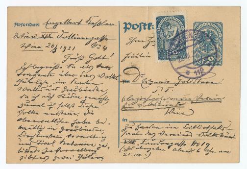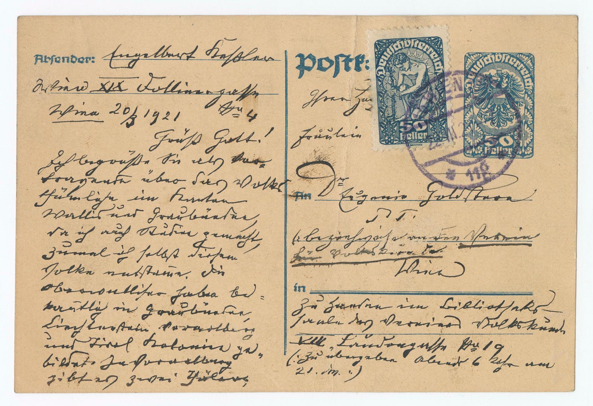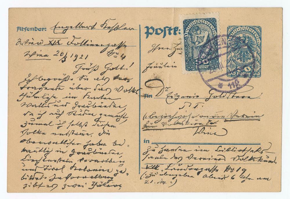 FräuleinAn Dr Eugenie GoldsternP. T.(beziehweise an den Vereinfür Volkskunde.Wien)zu Handen im Bibliotheks-saale des Vereines VolkskundeVIII. Laudongasse No 19(: zu übergeben abends 6 Uhr am21. dm.:)