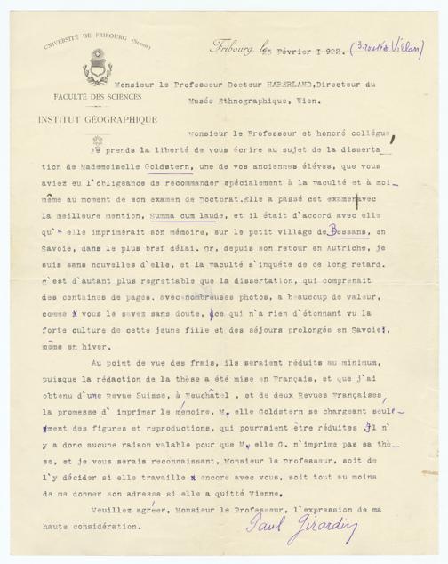 Je prends la liberté de vous écrire au sujet de la disserta-tion de Mademoiselle Goldstern, une de vos anciennes éléves, que vousaviez eu l'obligeance de recommander spécialement à la Faculté et à moi-même au moment de son examen de Doctorat. Elle a passé cet examenavecla meilleure mention, Summa cum laude, et il était d'accord avec ellequ'elle imprimerait son mémoire, sur le petit village de Bessans, enSavoie, dans le plus bref délai. Or, depuis son retour en Autriche, jesuis sans nouvelles d'elle, et la Faculté s'inquiéte de ce long retard.c'est d'autant plus regrettable que la dissertation, qui comprenaitdes centaines de pages. avec nombreuses photos, a beaucoup de valeur,comme vous le savez sans doute, ce qui n'a rien d'étonnant vu laforte culture de cette jeune fille et des séjours prolongés en Savoie,même en hiver.