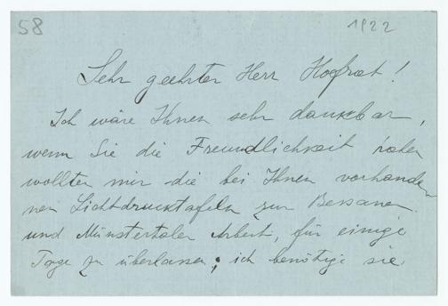 581922Sehr geehrter Herr Hofrat!Ich wäre Ihnen sehr dankbar,wenn Sie die Freundlichkeit habenwollten mir die bei Ihnen vorhande-nen Lichtdrucktafeln zur Bessanerund Münstertaler Arbeit, für einigeTage zu überlassen; ich benötige sie