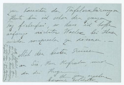zur Korrektur der Tafelerklärungen.Heute bin ich schon den ganzenTag fieberfrei, so dass ich hoffeanfangs nächster Woche bei Ihnenwieder vorsprechen zu können.Mit den besten Grüssenan Sie Herr Hofrat, undan die IhrigenIhre ganz ergebeneEugenie Goldstern Bitte höflichst mir die Tafeln mit den Kindern der Hausbesorgerin zu schicken; sie kommen täglich ins Sanatorium