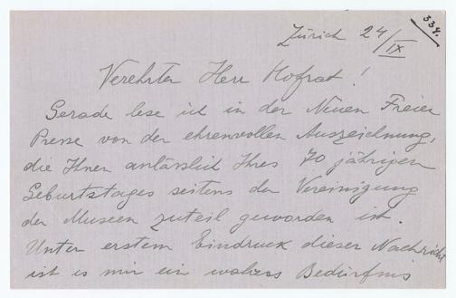 334. Zürich 24/IX Verehrter Herr Hofrat! Gerade lese ich in der Neuen Freien Presse von der ehrenvollen Auszeichnung, die Ihnen anlässlich Ihres 70 jährigen Geburtstages seitens der Vereinigung der Museen zuteil geworden ist. Unter erstem Eindruck dieser Nachricht ist es mir ein wahres Bedürfnis