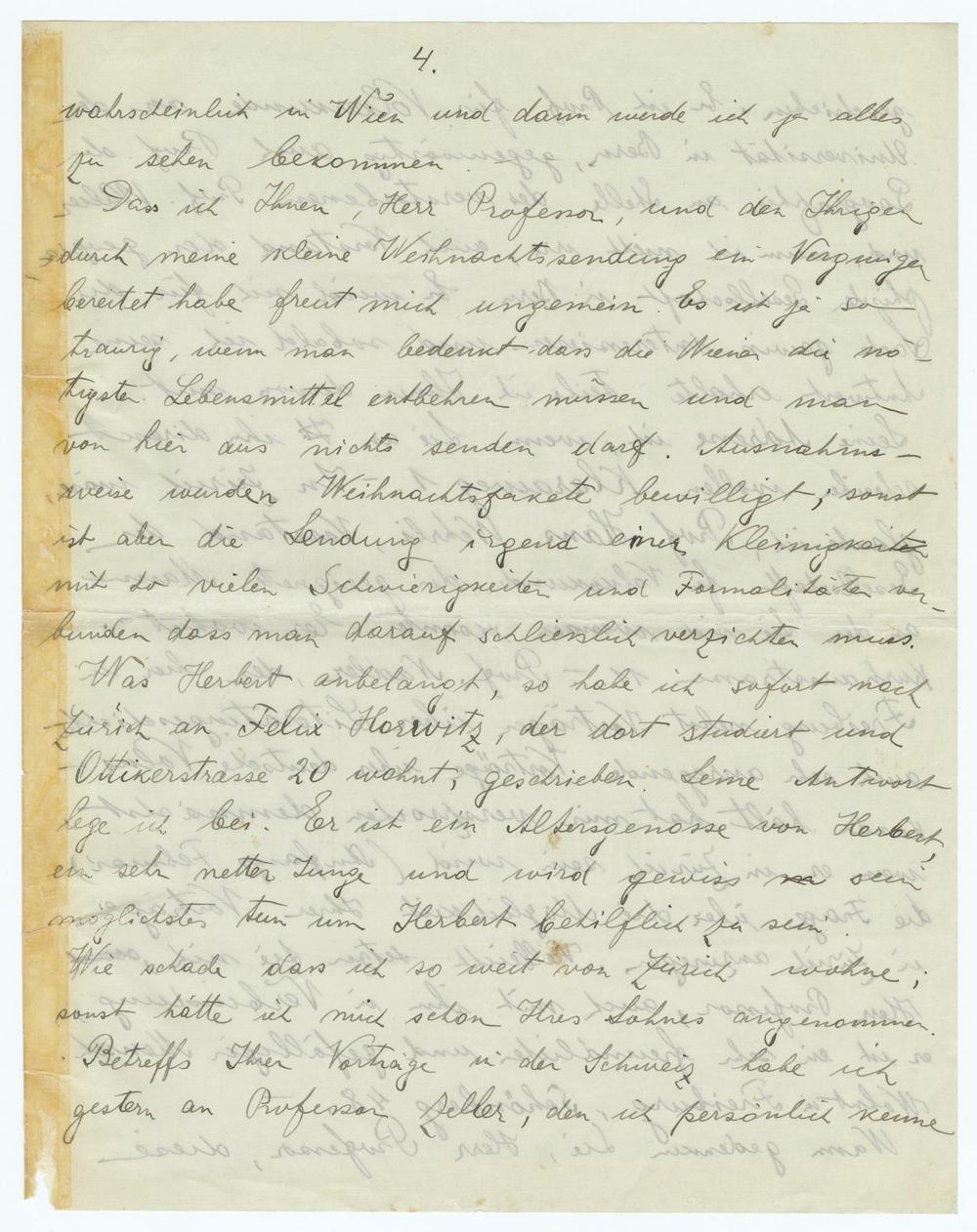 4. wahrscheinlich in Wien und dann werde ich ja alles zu sehen bekommen. Dass ich Ihnen, Herr Professor, und den Ihrigen durch meine kleine Weihnachtssendung ein Vergnügen bereitet habe freut mich ungemein. Es ist ja so traurig, wenn man bedenkt, dass die Wiener die nö- tigsten Lebensmittel entbehren müssen und man von hier aus nichts senden darf. Ausnahms weise wurden Weihnachtspakete bewilligt; sonst ist aber die Sendung irgend einer Kleinigkeit mit so vielen Schwierigkeiten und Formalitäten ver- bunden dass man darauf schliesslich verzichten muss. Was Herbert anbelangt, so habe ich sofort nach Zürich an Felix Horwitz, der dort studiert und Ottikerstrasse 20 wohnt, geschrieben. Seine Antwort lege ich bei. Er ist ein Altersgenosse von Herbert, ein sehr netter Junge und wird gewiss sein möglichstes tun um Herbert behilflich zu sein. Wie schade dass ich so weit von Zürich wohne; sonst hätte ich mich schon Ihres Sohnes angenommen. Betreffs Ihrer Vorträge in der Schweiz habe ich Gestern an Professor Zeller, den ich persönlich kenne
