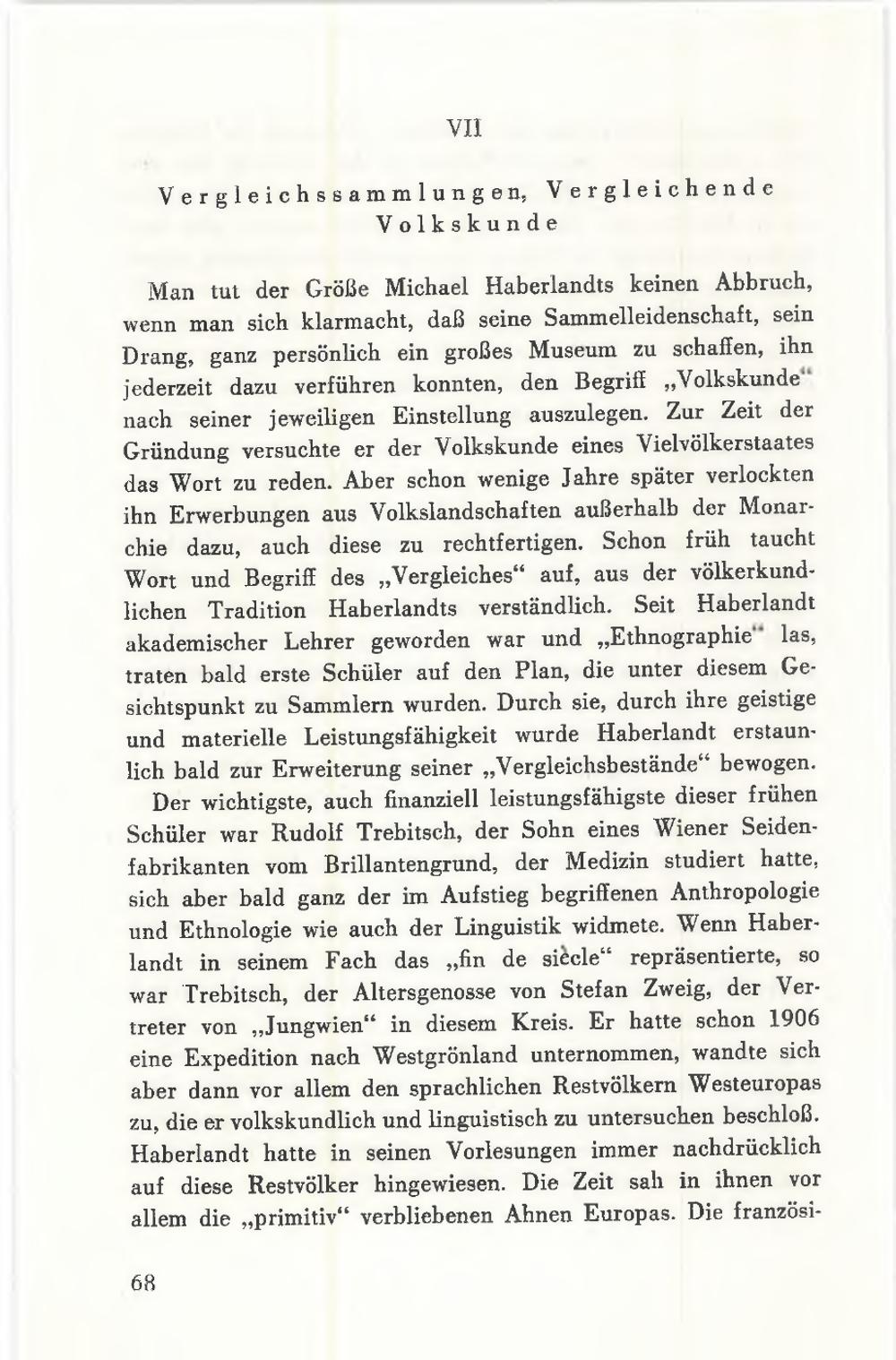 Man tut der Größe Michael Haberlandts keinen Abbruch,wenn man sich klarmacht, daß seine Sammelleidenschaft, seinDrang, ganz persönlich ein großes Museum zu schaffen, ihnjederzeit dazu verführen konnten, den Begriff„, Volkskunde"nach seiner jeweiligen Einstellung auszulegen. Zur Zeit derGründung versuchte er der Volkskunde eines Vielvölkerstaatesdas Wort zu reden. Aber schon wenige Jahre später verlocktenihn Erwerbungen aus Volkslandschaften außerhalb der Monar-chie dazu, auch diese zu rechtfertigen. Schon früh tauchtWort und Begriff des„ Vergleiches" auf, aus der völkerkund-lichen Tradition Haberlandts verständlich. Seit Haberlandtakademischer Lehrer geworden war und„ Ethnographie" las,traten bald erste Schüler auf den Plan, die unter diesem Ge-sichtspunkt zu Sammlern wurden. Durch sie, durch ihre geistigeund materielle Leistungsfähigkeit wurde Haberlandt erstaun-lich bald zur Erweiterung seiner„, Vergleichsbestände" bewogen.Der wichtigste, auch finanziell leistungsfähigste dieser frühenSchüler war Rudolf Trebitsch, der Sohn eines Wiener Seiden-fabrikanten vom Brillantengrund, der Medizin studiert hatte,sich aber bald ganz der im Aufstieg begriffenen Anthropologieund Ethnologie wie auch der Linguistik widmete. Wenn Haber-landt in seinem Fach das„ fin de siècle" repräsentierte, sowar Trebitsch, der Altersgenosse von Stefan Zweig, der Ver-treter von ,, Jungwien" in diesem Kreis. Er hatte schon 1906eine Expedition nach Westgrönland unternommen, wandte sichaber dann vor allem den sprachlichen Restvölkern Westeuropaszu, die er volkskundlich und linguistisch zu untersuchen beschloẞ.Haberlandt hatte in seinen Vorlesungen immer nachdrücklichauf diese Restvölker hingewiesen. Die Zeit sah in ihnen vorallem die„ primitiv Glossar ::: zum Glossareintrag primitiv" verbliebenen Ahnen Europas. Die französi-