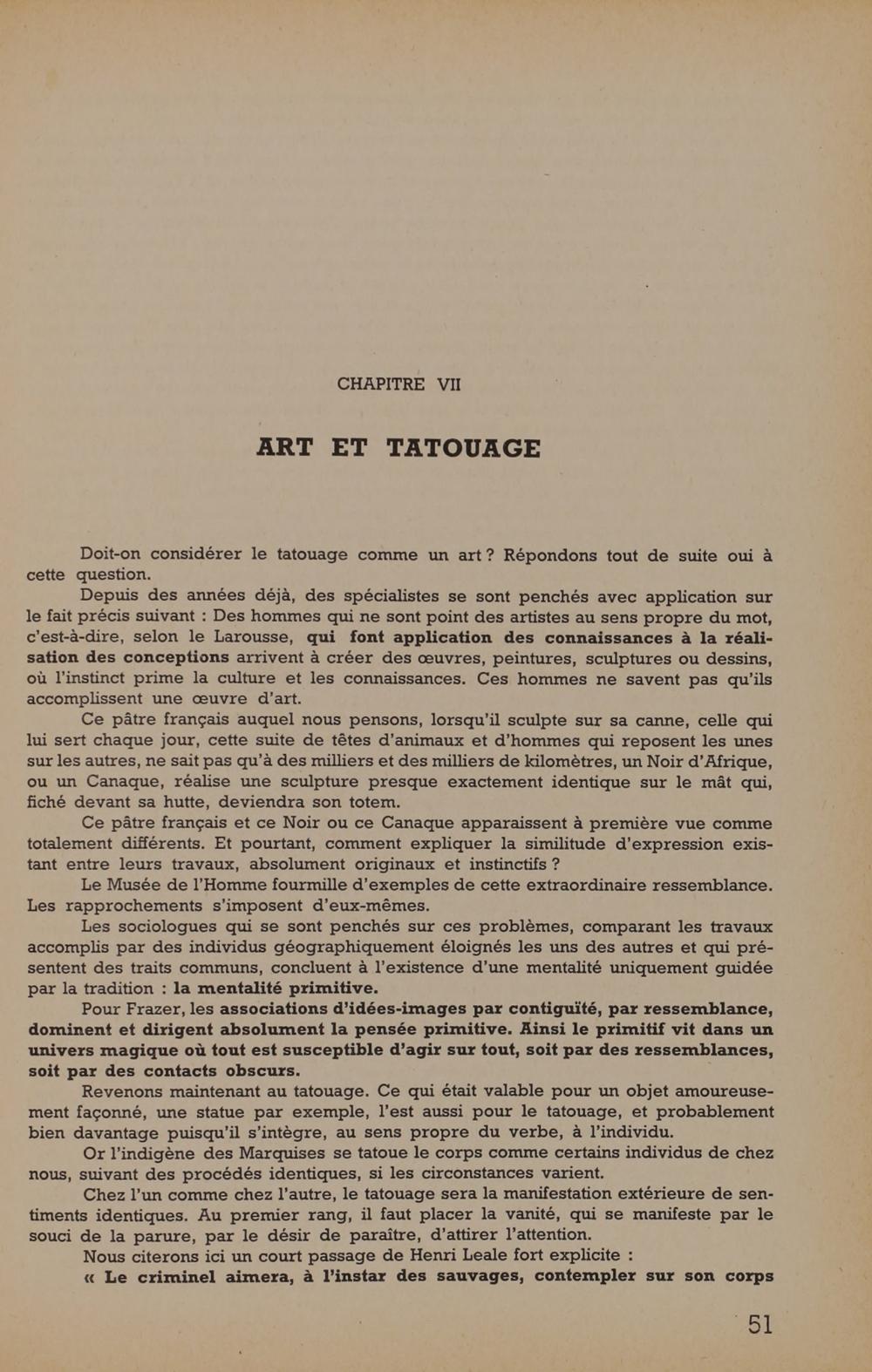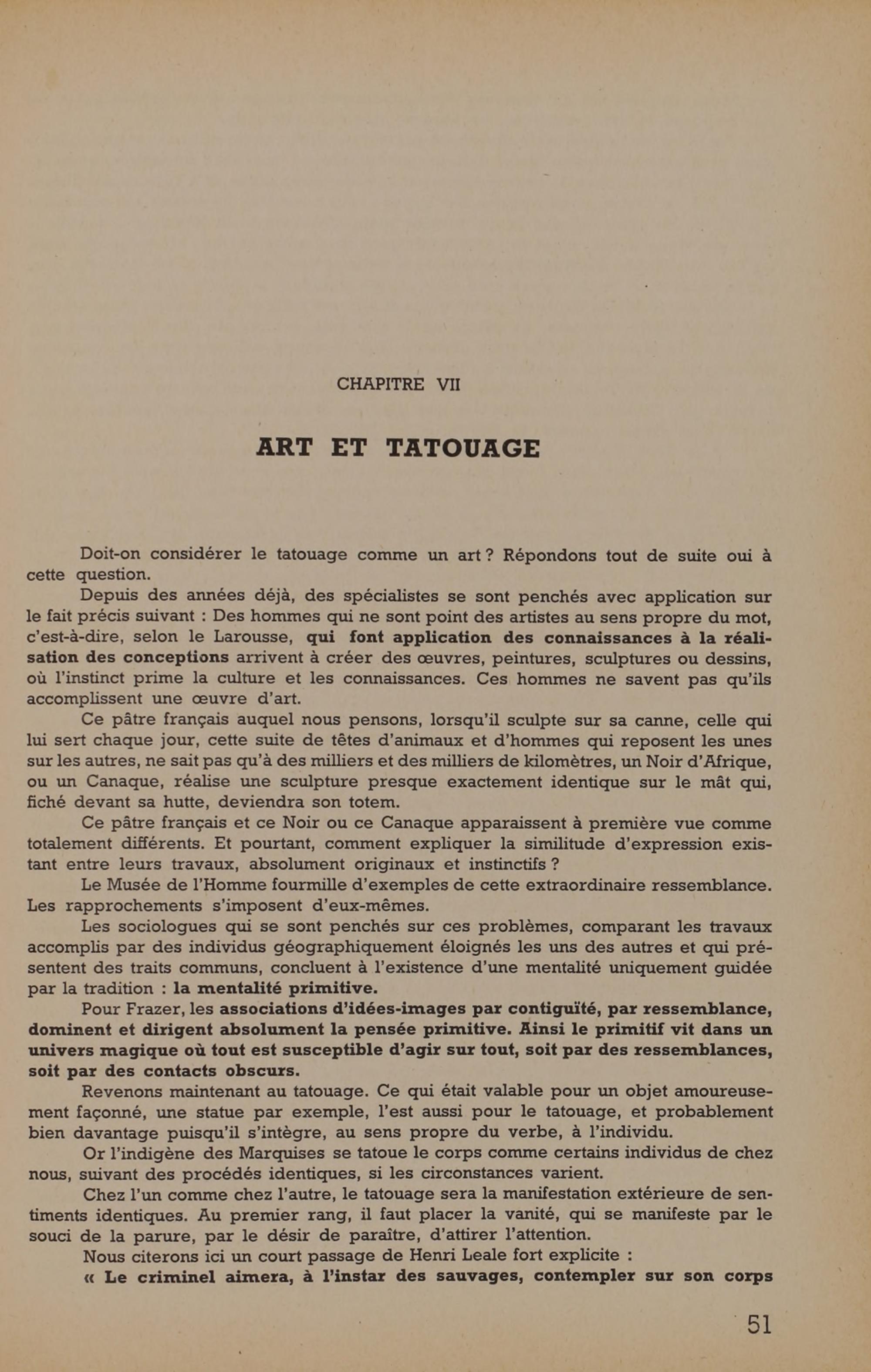Ce pâtre français auquel nous pensons, lorsqu'il sculpte sur sa canne, celle quilui sert chaque jour, cette suite de têtes d'animaux et d'hommes qui reposent les unessur les autres, ne sait pas qu'à des milliers et des milliers de kilomètres, un Noir d'Afrique,ou un Canaque, réalise une sculpture presque exactement identique sur le mât qui,fiché devant sa hutte, deviendra son totem.