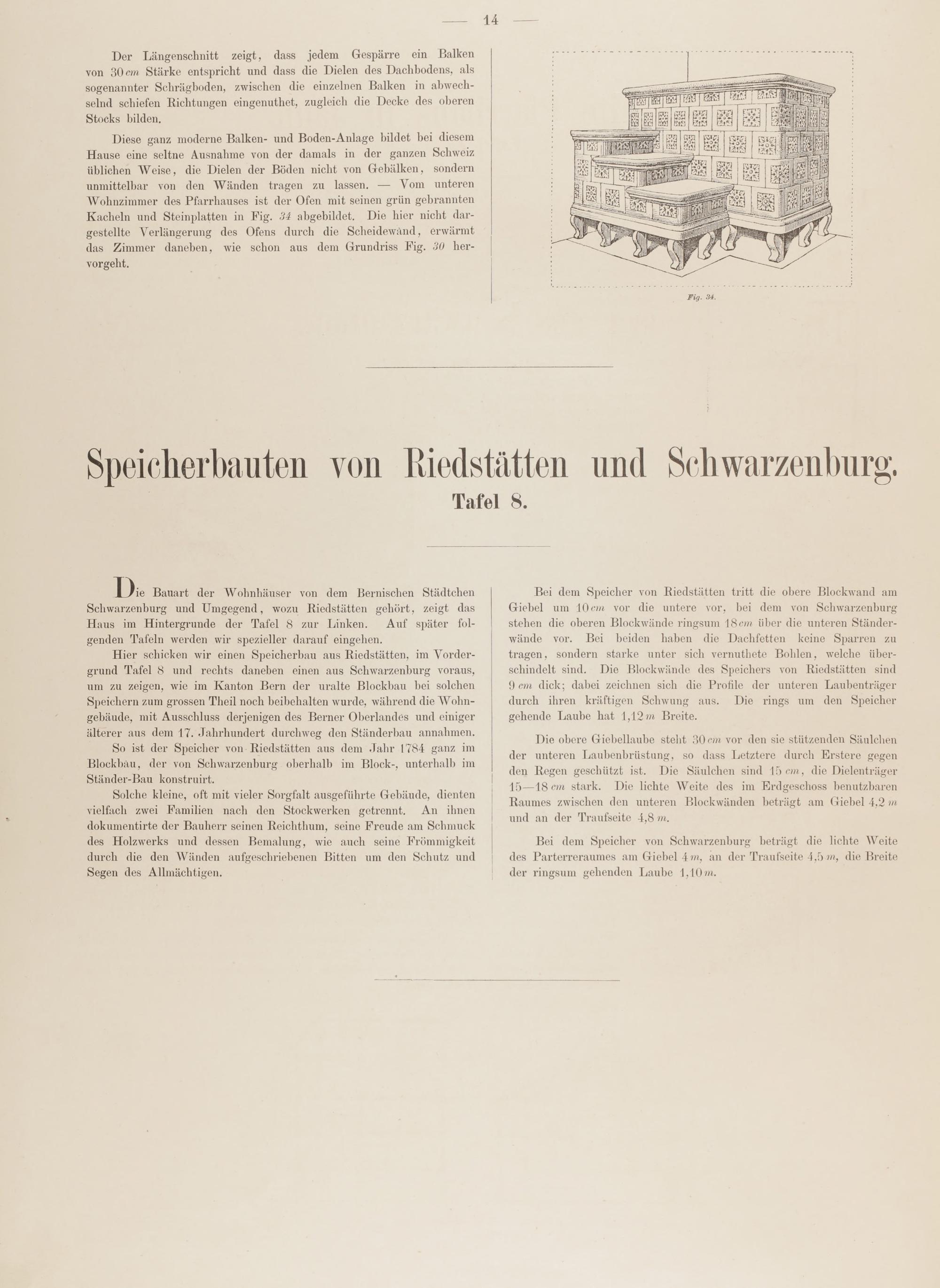 So ist der Speicher von Riedstätten aus dem Jahr 1784 ganz imBlockbau, der von Schwarzenburg oberhalb im Block-, unterhalb imStänder- Bau konstruirt.