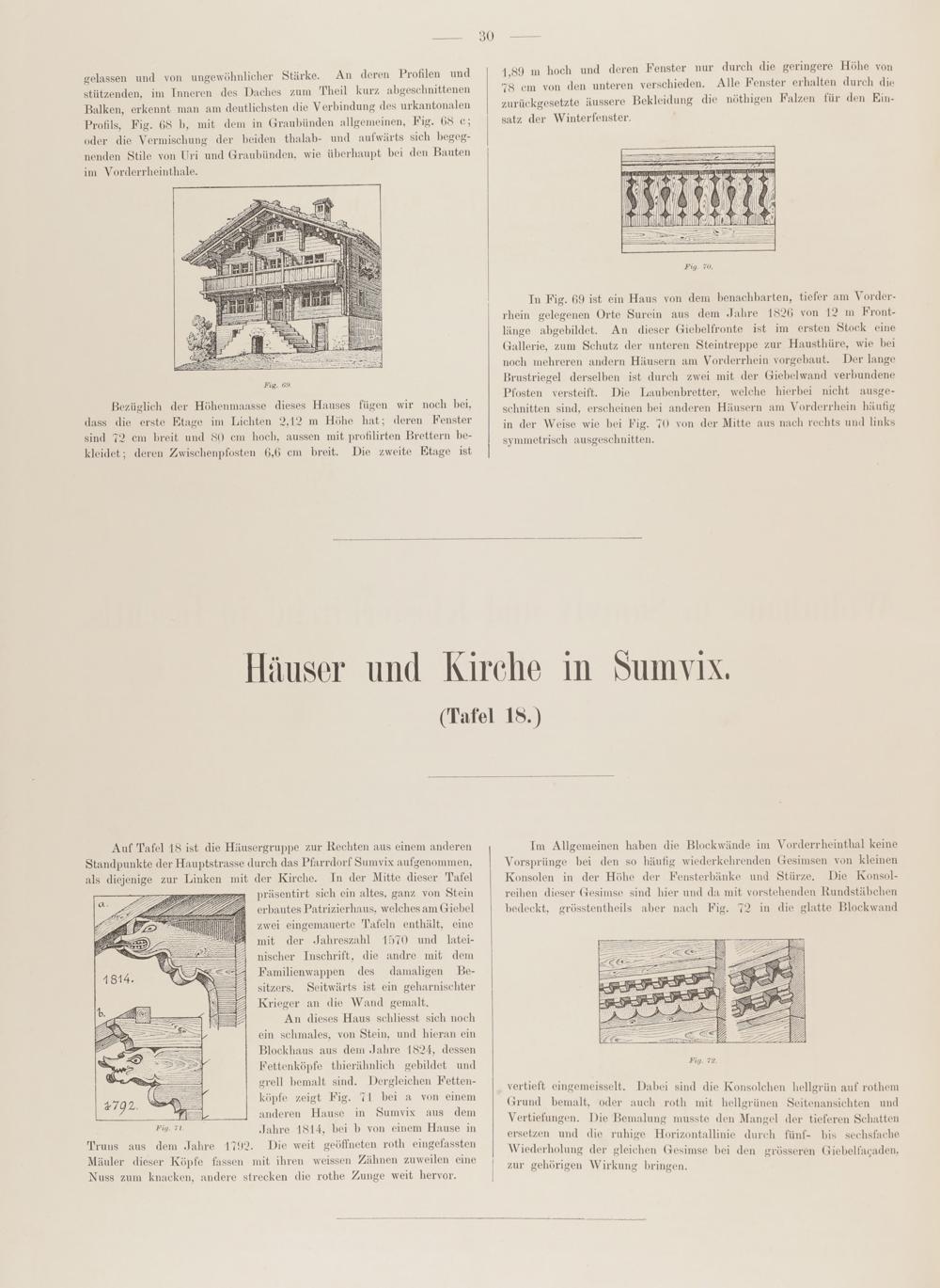Auf Tafel 18 ist die Häusergruppe zur Rechten aus einem anderenStandpunkte der Hauptstrasse durch das Pfarrdorf Sumvix aufgenommen,als diejenige zur Linken mit der Kirche. In der Mitte dieser Tafel