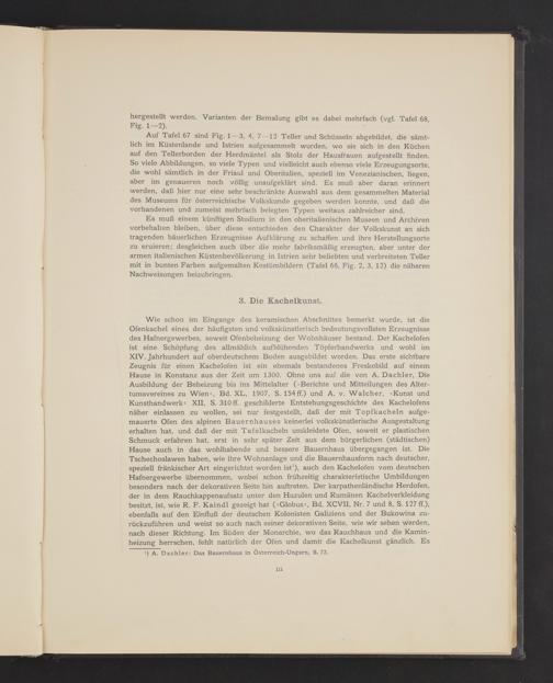 Es muß einem künftigen Studium in den oberitalienischen Museen und Archivenvorbehalten bleiben, über diese entschieden den Charakter der Volkskunst an sichtragenden bäuerlichen Erzeugnisse Aufklärung zu schaffen und ihre Herstellungsortezu eruieren; desgleichen auch über die mehr fabriksmäßig erzeugten, aber unter derarmen italienischen Küstenbevölkerung in Istrien sehr beliebten und verbreiteten Tellermit in bunten Farben aufgemalten Kostümbildern( Tafel 66, Fig. 2, 3, 12) die näherenNachweisungen beizubringen.