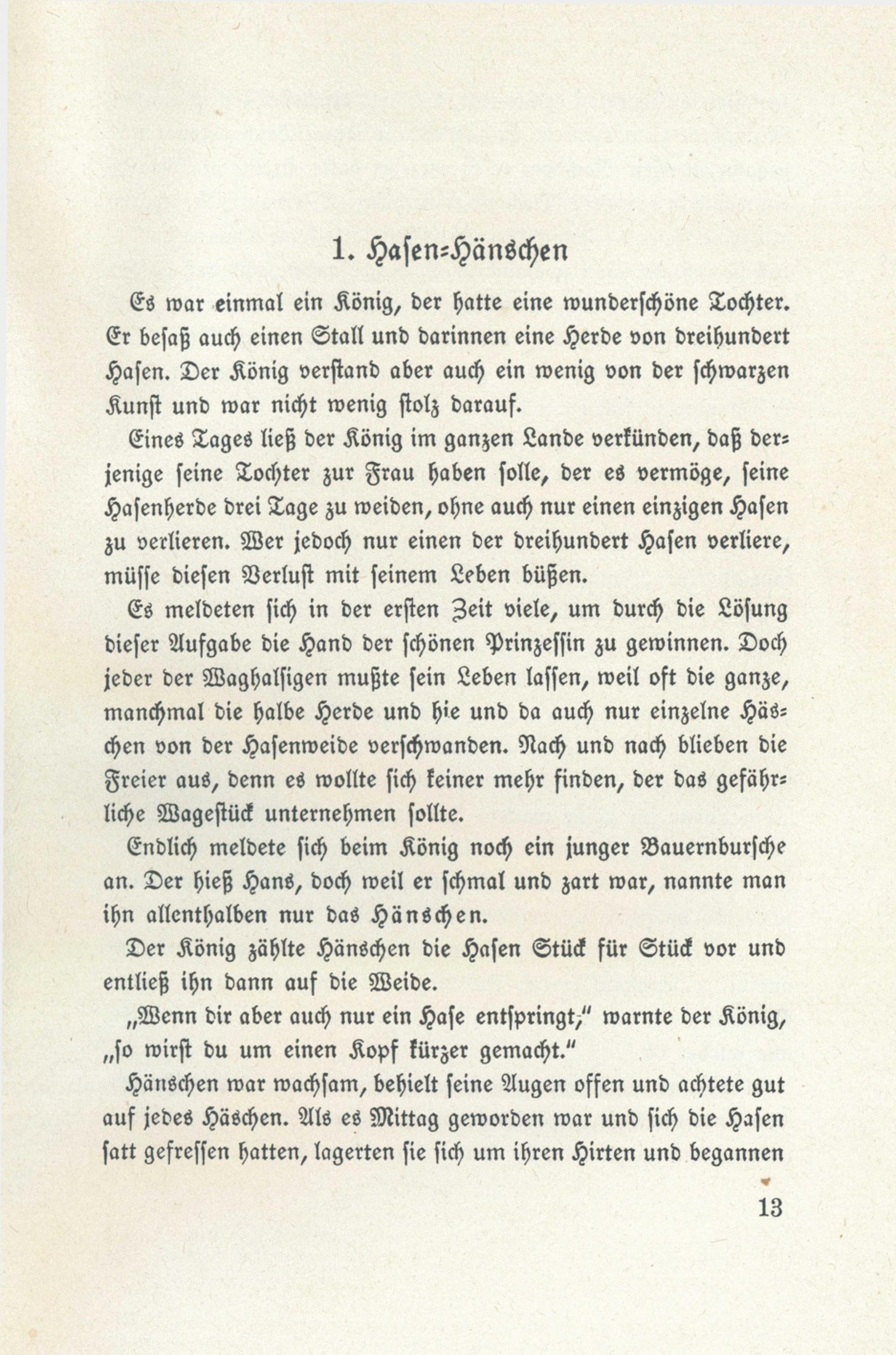 Es meldeten sich in der ersten Zeit viele, um durch die Lösungdieser Aufgabe die Hand der schönen Prinzessin zu gewinnen. Dochjeder der Waghalsigen mußte sein Leben lassen, weil oft die ganze,manchmal die halbe Herde und hie und da auch nur einzelne Häs-chen von der Hasenweide verschwanden. Nach und nach blieben dieFreier aus, denn es wollte sich keiner mehr finden, der das gefähr=liche Wagestück unternehmen sollte.