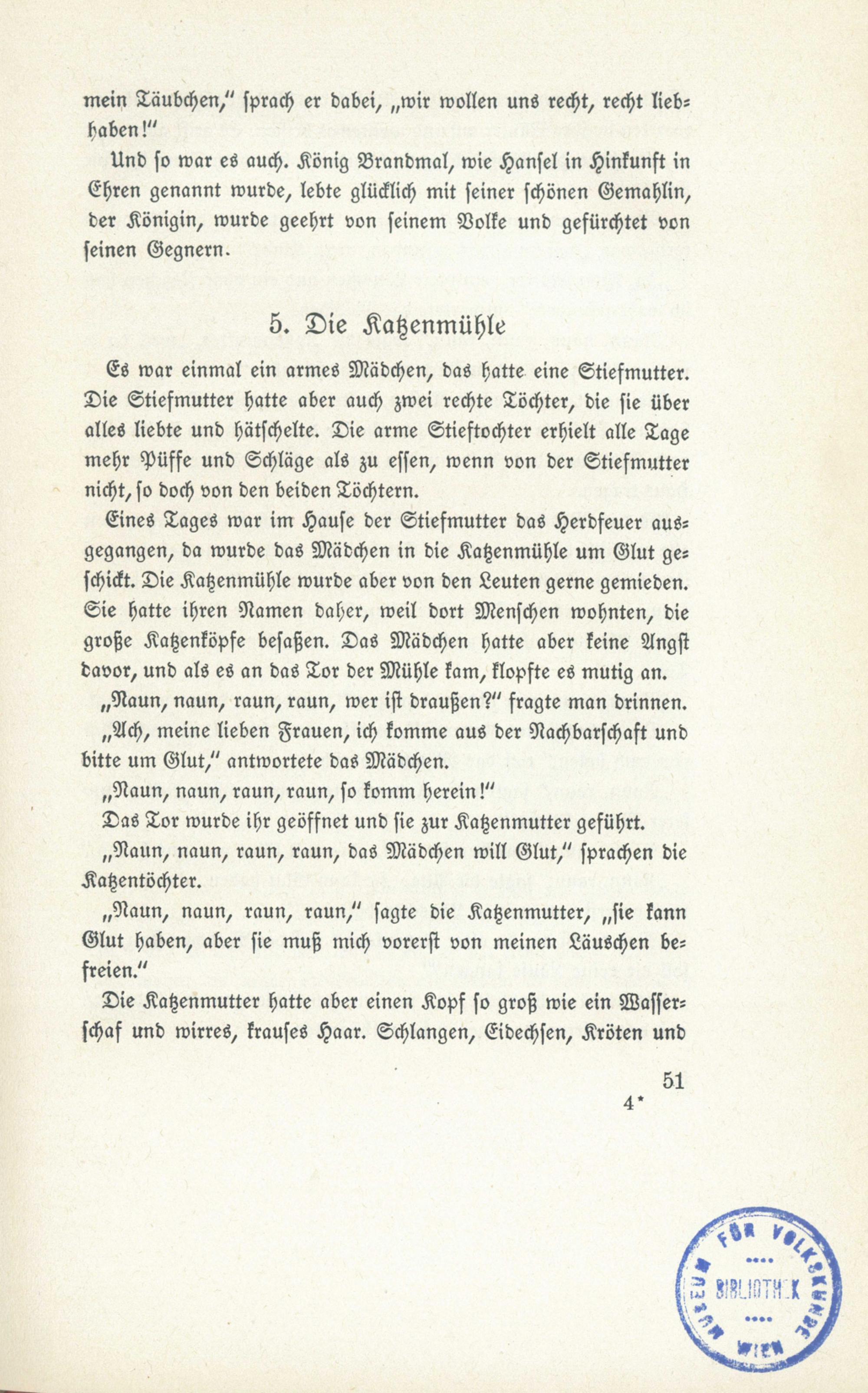 Eines Tages war im Hause der Stiefmutter das Herdfeuer aus-gegangen, da wurde das Mädchen in die Kazenmühle um Glut ge=schickt. Die Katzenmühle wurde aber von den Leuten gerne gemieden.Sie hatte ihren Namen daher, weil dort Menschen wohnten, diegroße Kazenköpfe besaßen. Das Mädchen hatte aber keine Angstdavor, und als es an das Tor der Mühle kam, klopfte es mutig an.,, Naun, naun, raun, raun, wer ist draußen?" fragte man drinnen.,, Ach, meine lieben Frauen, ich komme aus der Nachbarschaft undbitte um Glut," antwortete das Mädchen.