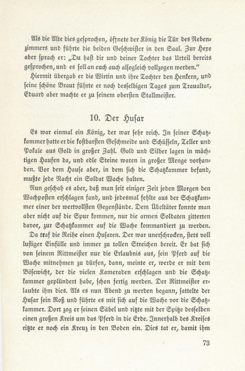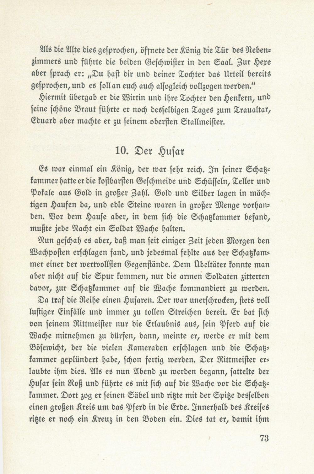 Da traf die Reihe einen Husaren. Der war unerschrocken, stets volllustiger Einfälle und immer zu tollen Streichen bereit. Er bat sichvon seinem Rittmeister nur die Erlaubnis aus, sein Pferd auf dieBache mitnehmen zu dürfen, dann, meinte er, werde er mit demBösewicht, der die vielen Kameraden erschlagen und die Schatz-kammer geplündert habe, schon fertig werden. Der Rittmeister er-laubte ihm dies. Als es nun Abend zu werden begann, sattelte derHusar sein Roß und führte es mit sich auf die Wache vor die Schah-kammer. Dort zog er seinen Säbel und rizte mit der Spize desselbeneinen großen Kreis um das Pferd in die Erde. Innerhalb des Kreisesrigte er noch ein Kreuz in den Boden ein. Dies tat er, damit ihm