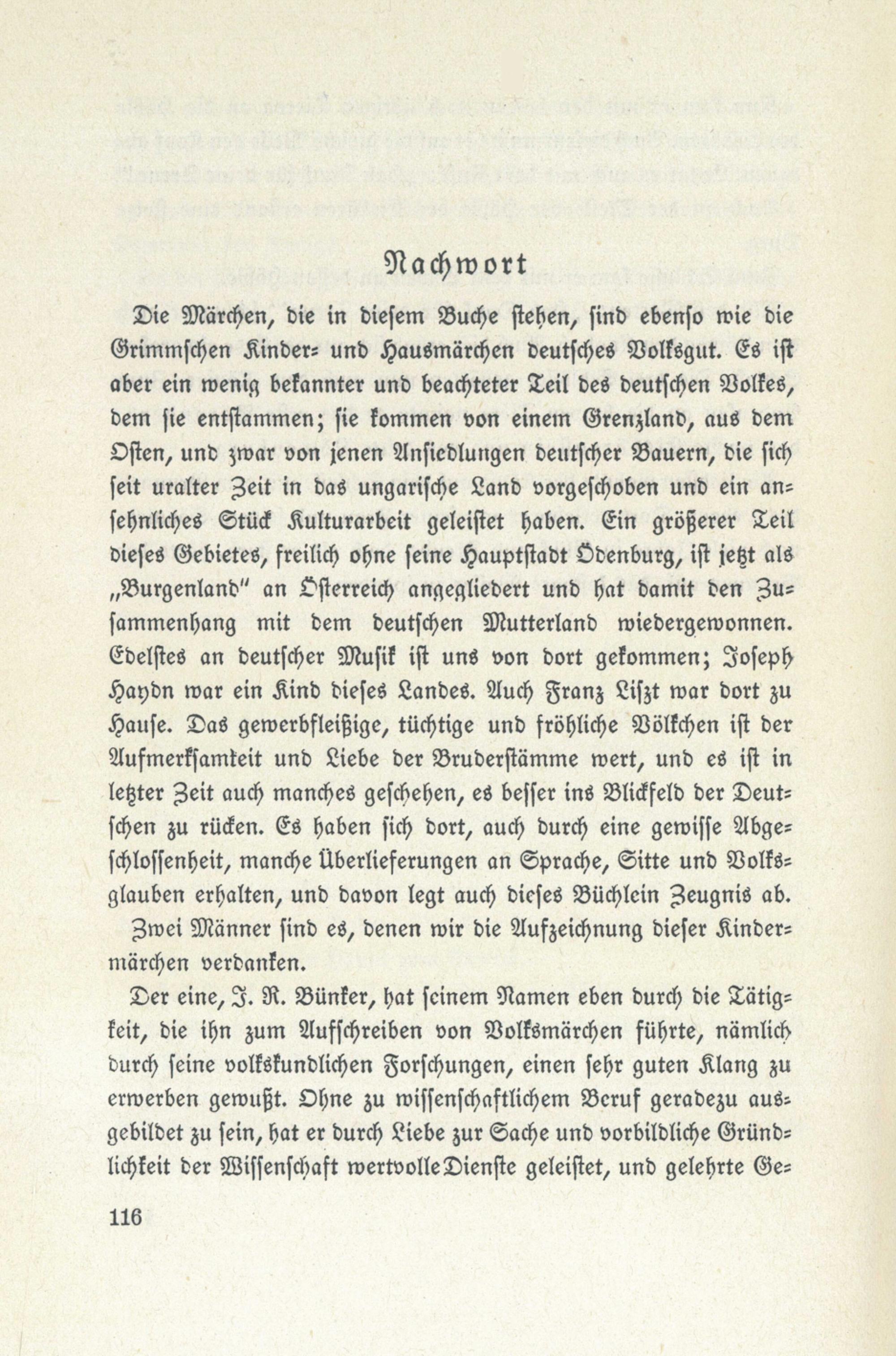 Die Märchen, die in diesem Buche stehen, sind ebenso wie dieGrimmschen Kinder- und Hausmärchen deutsches Volksgut. Es istaber ein wenig bekannter und beachteter Teil des deutschen Volkes,dem sie entstammen; sie kommen von einem Grenzland, aus demOften, und zwar von jenen Ansiedlungen deutscher Bauern, die sichseit uralter Zeit in das ungarische Land vorgeschoben und ein an-sehnliches Stück Kulturarbeit geleistet haben. Ein größerer Zeildieses Gebietes, freilich ohne seine Hauptstadt Ödenburg, ist jetzt als,, Burgenland" an Österreich angegliedert und hat damit den Zu-sammenhang mit dem deutschen Mutterland wiedergewonnen.Edelstes an deutscher Musik ist uns von dort gekommen; JosephHaydn war ein Kind dieses Landes. Auch Franz Liszt war dort zuHause. Das gewerbfleißige, tüchtige und fröhliche Völkchen ist derAufmerksamkeit und Liebe der Bruderstämme wert, und es ist inletzter Zeit auch manches geschehen, es besser ins Blickfeld der Deut-schen zu rücken. Es haben sich dort, auch durch eine gewisse Abge=schlossenheit, manche Überlieferungen an Sprache, Sitte und Volks-glauben erhalten, und davon legt auch dieses Büchlein Zeugnis ab.Zwei Männer sind es, denen wir die Aufzeichnung dieser Kinder-märchen verdanken.