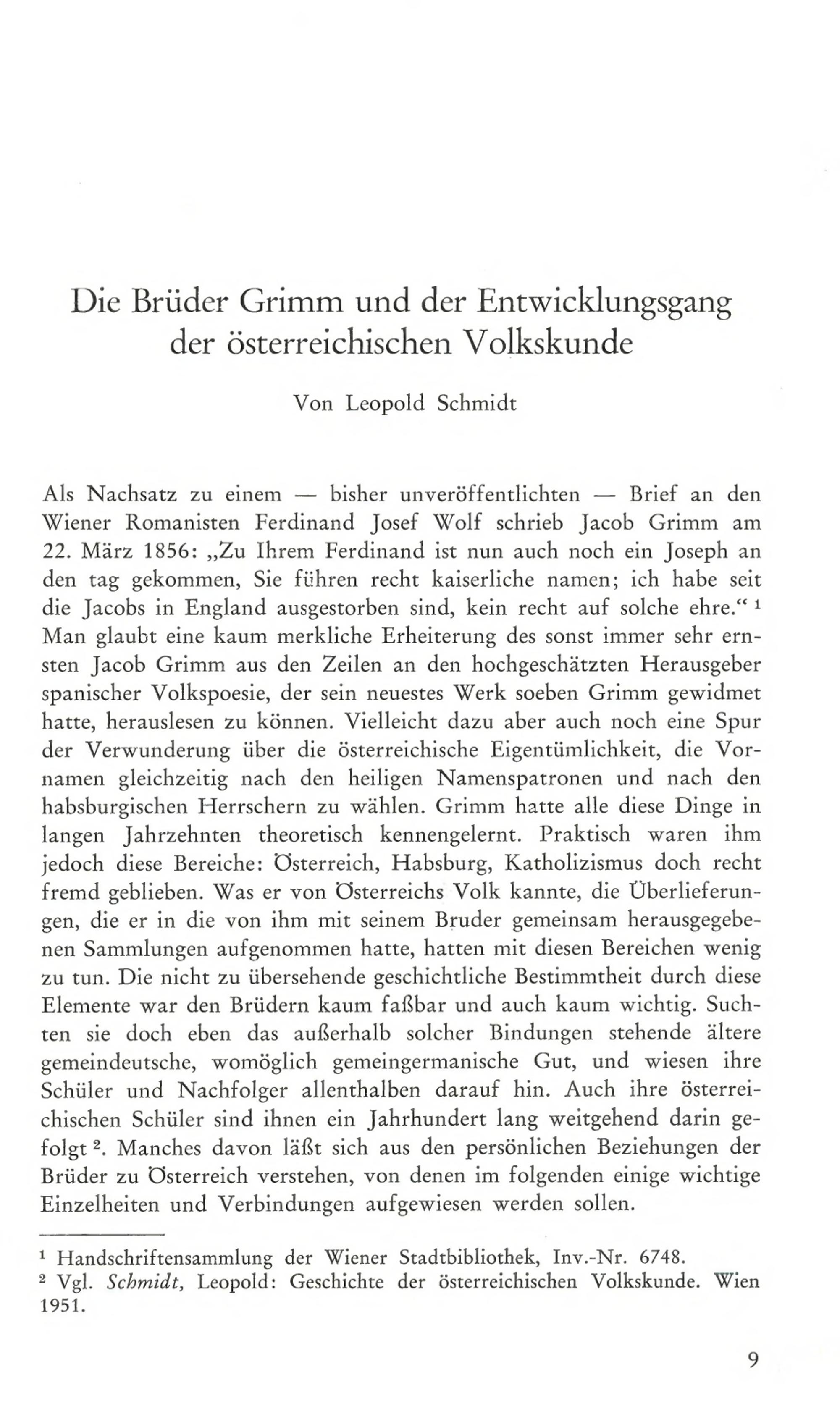 Als Nachsatz zu einem bisher unveröffentlichten Brief an denWiener Romanisten Ferdinand Josef Wolf schrieb Jacob Grimm am22. März 1856:„ Zu Ihrem Ferdinand ist nun auch noch ein Joseph anden tag gekommen, Sie führen recht kaiserliche namen; ich habe seitdie Jacobs in England ausgestorben sind, kein recht auf solche ehre." 1Man glaubt eine kaum merkliche Erheiterung des sonst immer sehr ern-sten Jacob Grimm aus den Zeilen an den hochgeschätzten Herausgeberspanischer Volkspoesie, der sein neuestes Werk soeben Grimm gewidmethatte, herauslesen zu können. Vielleicht dazu aber auch noch eine Spurder Verwunderung über die österreichische Eigentümlichkeit, die Vor-namen gleichzeitig nach den heiligen Namenspatronen und nach denhabsburgischen Herrschern zu wählen. Grimm hatte alle diese Dinge inlangen Jahrzehnten theoretisch kennengelernt. Praktisch waren ihmjedoch diese Bereiche: Österreich, Habsburg, Katholizismus doch rechtfremd geblieben. Was er von Österreichs Volk kannte, die Überlieferun-gen, die er in die von ihm mit seinem Bruder gemeinsam herausgegebe-nen Sammlungen aufgenommen hatte, hatten mit diesen Bereichen wenigzu tun. Die nicht zu übersehende geschichtliche Bestimmtheit durch dieseElemente war den Brüdern kaum faßbar und auch kaum wichtig. Such-ten sie doch eben das außerhalb solcher Bindungen stehende älteregemeindeutsche, womöglich gemeingermanische Gut, und wiesen ihreSchüler und Nachfolger allenthalben darauf hin. Auch ihre österrei-chischen Schüler sind ihnen ein Jahrhundert lang weitgehend darin ge-folgt 2. Manches davon läßt sich aus den persönlichen Beziehungen derBrüder zu Österreich verstehen, von denen im folgenden einige wichtigeEinzelheiten und Verbindungen aufgewiesen werden sollen.