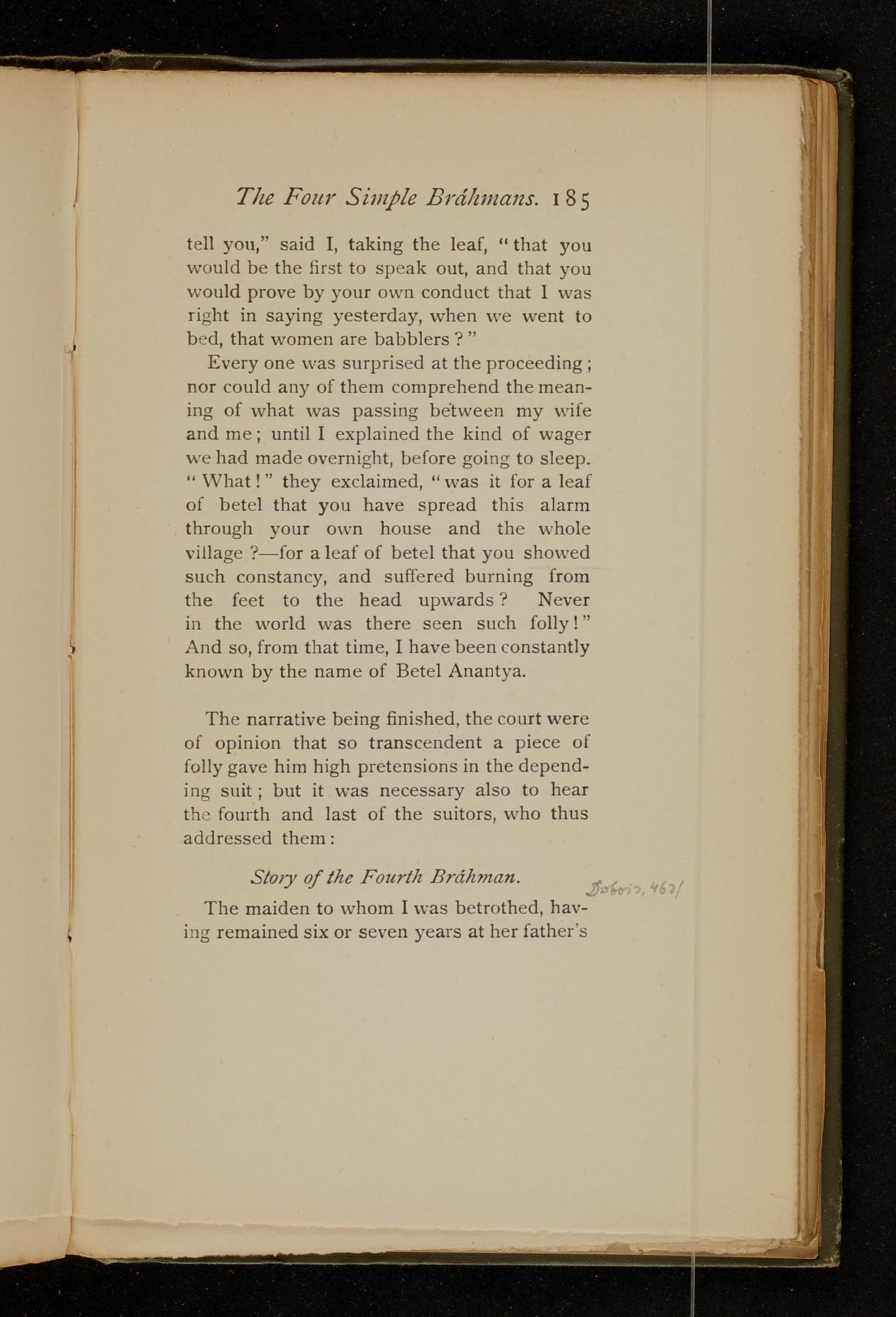 Every one was surprised at the proceeding;nor could any of them comprehend the mean-ing of what was passing between my wifeand me; until I explained the kind of wagerwe had made overnight, before going to sleep." What!" they exclaimed," was it for a leafof betel that you have spread this alarmthrough your own house and the wholevillage?-for a leaf of betel that you showedsuch constancy, and suffered burning fromthe feet to the head upwards? Neverin the world was there seen such folly!"And So, from that time, I have been constantlyknown by the name of Betel Anantya.