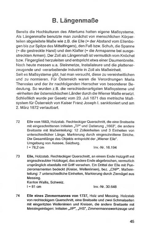 Elle von 1663, Holzstab. Rechteckiger Querschnitt, die eine Breitseitemit eingeschnittenen Initialen„ TP“ und Datierung„ 1663", die andereBreitseite mit Maßeinteilung: 12 Zolleinheiten und 3 Einheiten vonunterschiedlicher Länge. Markierung durch eingeschnittene Striche.Die Gesamtlänge des Objekts entspricht der„ Wiener Elle".Umgebung von Aussee, Salzburg.