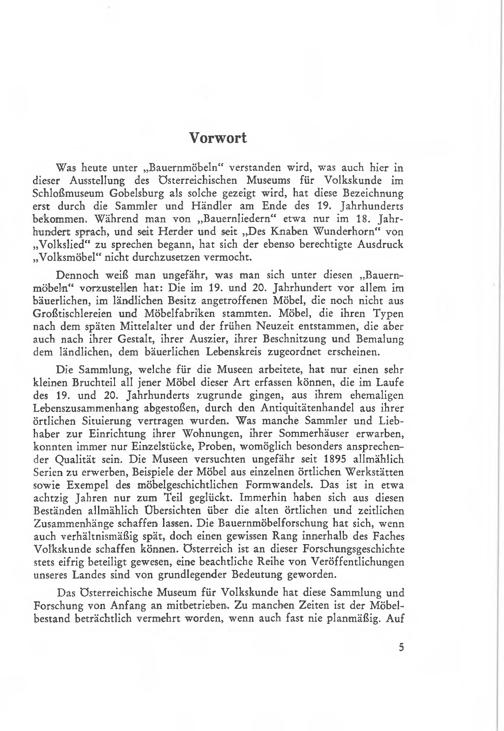 Was heute unter„ Bauernmöbeln" verstanden wird, was auch hier indieser Ausstellung des Österreichischen Museums für Volkskunde imSchloßmuseum Gobelsburg als solche gezeigt wird, hat diese Bezeichnungerst durch die Sammler und Händler am Ende des 19. Jahrhundertsbekommen. Während man von„ Bauernliedern" etwa nur im 18. Jahr-hundert sprach, und seit Herder und seit„ Des Knaben Wunderhorn" von,, Volkslied" zu sprechen begann, hat sich der ebenso berechtigte Ausdruck,, Volksmöbel" nicht durchzusetzen vermocht.