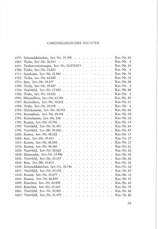 1789: Holzkassette, Inv.-Nr. 30.7451793: Bettaufsatz, Inv.-Nr. 19.4381793 Reiterkasten, Inv.-Nr. 3361793: Kasten, Inv.-Nr. 45.756.1797: Votivbild, Inv.-Nr. 51.4811798: Votivbild, Inv.-Nr. 53.0461800: Kasten, Inv.-Nr. 40.122.1809: Bett, Inv.-Nr. 39.4141813 Kasten, Inv.-Nr. 66.0501816: Kasten, Inv.-Nr. 46.3601825: Votivbild, Inv.-Nr. 50.6241829: Kleintruhe, Inv.-Nr. 19.996