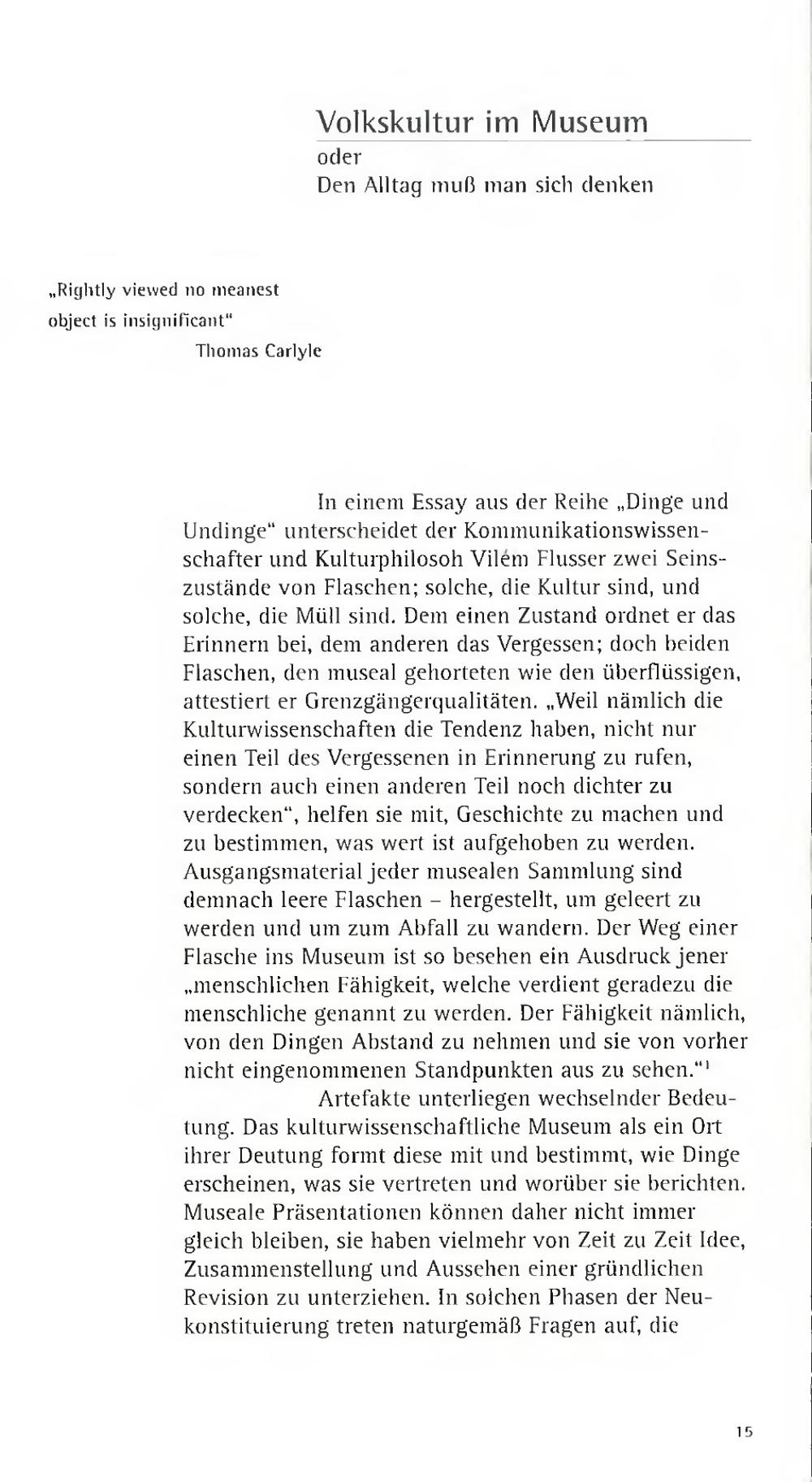 In einem Essay aus der Reihe„ Dinge undUndinge" unterscheidet der Kommunikationswissen-schafter und Kulturphilosoh Vilém Flusser zwei Seins-zustände von Flaschen; solche, die Kultur sind, undsolche, die Müll sind. Dem einen Zustand ordnet er dasErinnern bei, dem anderen das Vergessen; doch beidenFlaschen, den museal gehorteten wie den überflüssigen,attestiert er Grenzgängerqualitäten.„ Weil nämlich dieKulturwissenschaften die Tendenz haben, nicht nureinen Teil des Vergessenen in Erinnerung zu rufen,sondern auch einen anderen Teil noch dichter zuverdecken", helfen sie mit, Geschichte zu machen undzu bestimmen, was wert ist aufgehoben zu werden.Ausgangsmaterial jeder musealen Sammlung sinddemnach leere Flaschen- hergestellt, um geleert zuwerden und um zum Abfall zu wandern. Der Weg einerFlasche ins Museum ist so besehen ein Ausdruck jener,, menschlichen Fähigkeit, welche verdient geradezu diemenschliche genannt zu werden. Der Fähigkeit nämlich,von den Dingen Abstand zu nehmen und sie von vorhernicht eingenommenen Standpunkten aus zu sehen.“