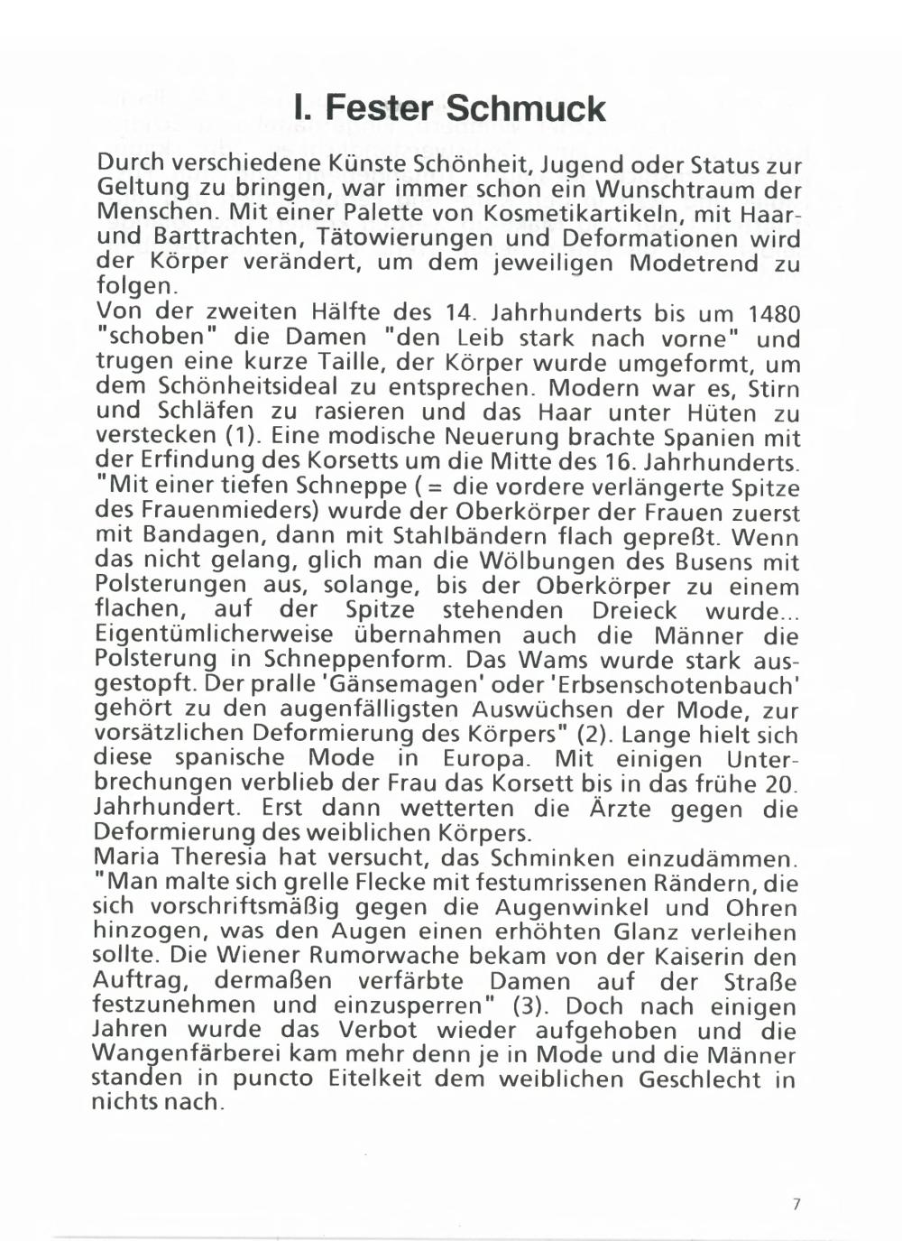 Von der zweiten Hälfte des 14. Jahrhunderts bis um 1480" schoben" die Damen" den Leib stark nach vorne" undtrugen eine kurze Taille, der Körper wurde umgeformt, umdem Schönheitsideal zu entsprechen. Modern war es, Stirnund Schläfen zu rasieren und das Haar unter Hüten zuverstecken( 1). Eine modische Neuerung brachte Spanien mitder Erfindung des Korsetts um die Mitte des 16. Jahrhunderts." Mit einer tiefen Schneppe(= die vordere verlängerte Spitzedes Frauenmieders) wurde der Oberkörper der Frauen zuerstmit Bandagen, dann mit Stahlbändern flach gepreßt. Wenndas nicht gelang, glich man die Wölbungen des Busens mitPolsterungen aus, solange, bis der Oberkörper zu einemflachen, auf der Spitze stehenden Dreieck wurde...Eigentümlicherweise übernahmen auch die Männer diePolsterung in Schneppenform. Das Wams wurde stark aus-gestopft. Der pralle' Gänsemagen' oder' Erbsenschotenbauch'gehört zu den augenfälligsten Auswüchsen der Mode, zurvorsätzlichen Deformierung des Körpers"( 2). Lange hielt sichdiese spanische Mode in Europa. Mit einigen Unter-brechungen verblieb der Frau das Korsett bis in das frühe 20.Jahrhundert. Erst dann wetterten die Ärzte gegen dieDeformierung des weiblichen Körpers.