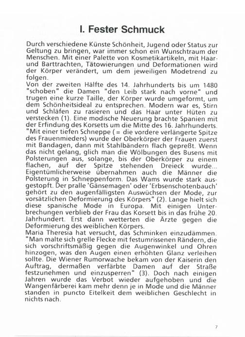 Durch verschiedene Künste Schönheit, Jugend oder Status zurGeltung zu bringen, war immer schon ein Wunschtraum derMenschen. Mit einer Palette von Kosmetikartikeln, mit Haar-und Barttrachten, Tätowierungen und Deformationen wirdder Körper verändert, um dem jeweiligen Modetrend zufolgen.