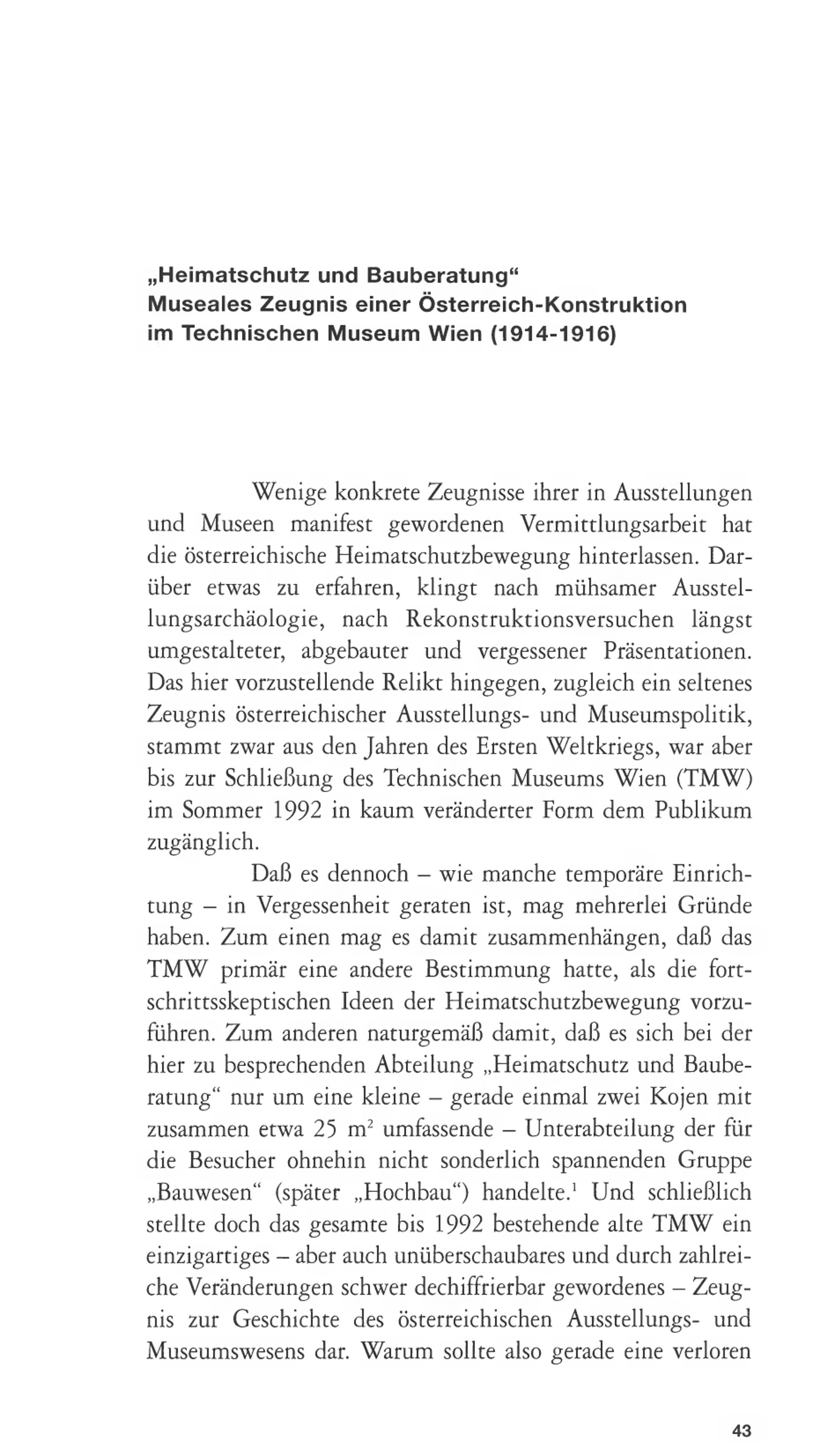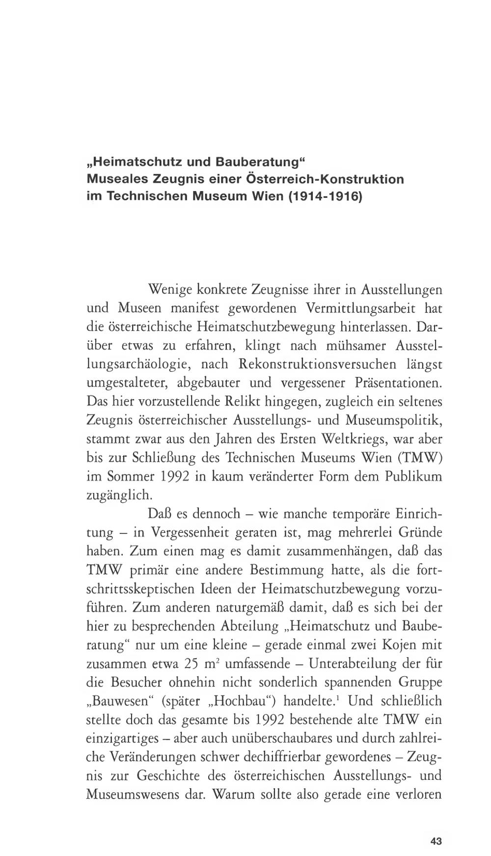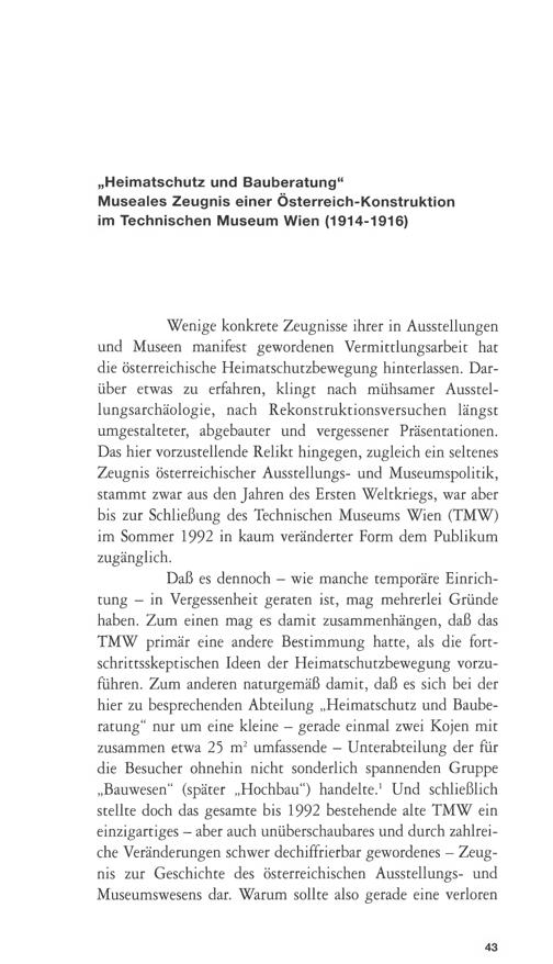 Wenige konkrete Zeugnisse ihrer in Ausstellungenund Museen manifest gewordenen Vermittlungsarbeit hatdie österreichische Heimatschutzbewegung hinterlassen. Dar-über etwas zu erfahren, klingt nach mühsamer Ausstel-lungsarchäologie, nach Rekonstruktionsversuchen längstumgestalteter, abgebauter und vergessener Präsentationen.Das hier vorzustellende Relikt hingegen, zugleich ein seltenesZeugnis österreichischer Ausstellungs- und Museumspolitik,stammt zwar aus den Jahren des Ersten Weltkriegs, war aberbis zur Schließung des Technischen Museums Wien( TMW)im Sommer 1992 in kaum veränderter Form dem Publikumzugänglich.