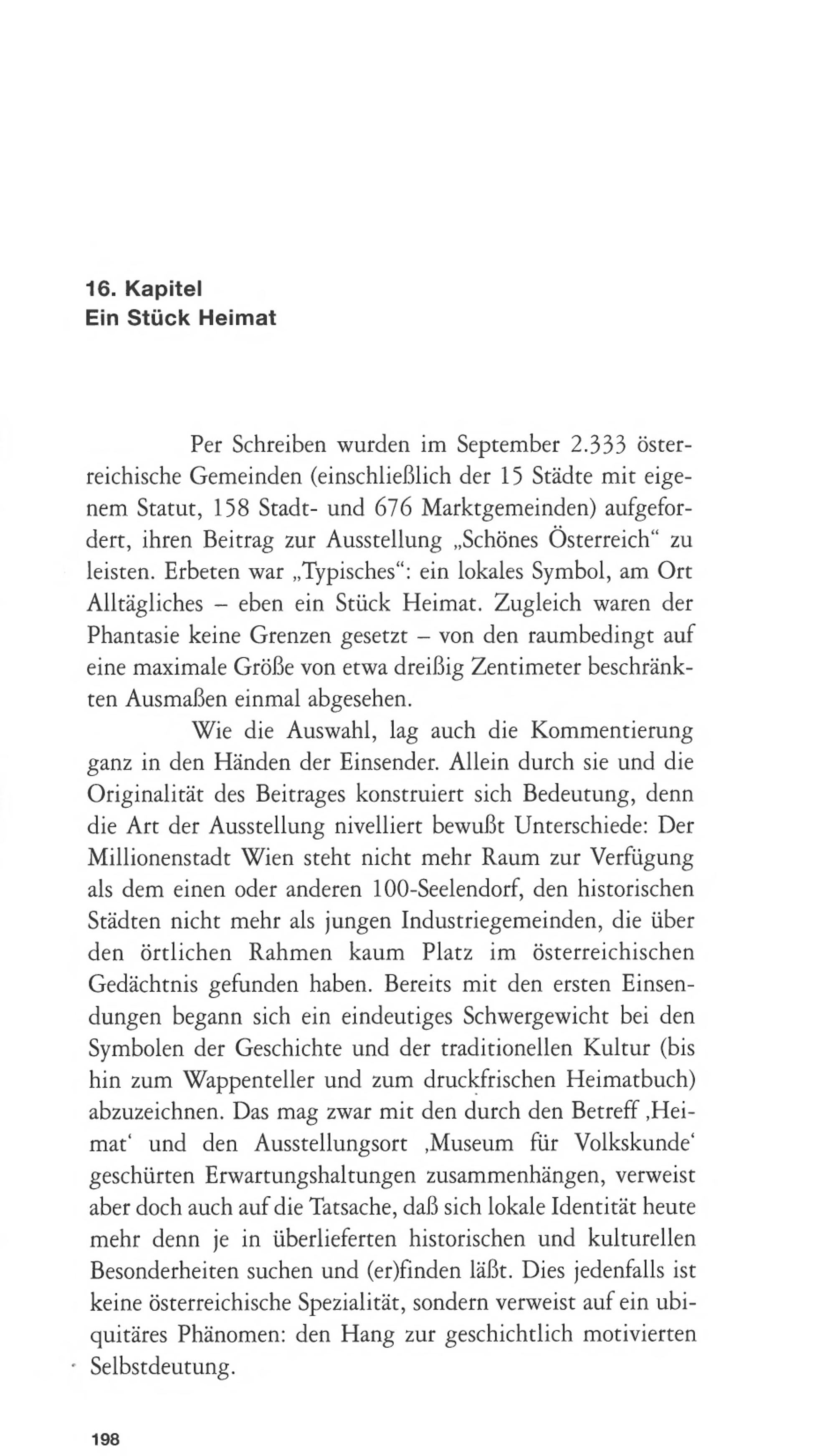Wie die Auswahl, lag auch die Kommentierungganz in den Händen der Einsender. Allein durch sie und dieOriginalität des Beitrages konstruiert sich Bedeutung, denndie Art der Ausstellung nivelliert bewußt Unterschiede: DerMillionenstadt Wien steht nicht mehr Raum zur Verfügungals dem einen oder anderen 100- Seelendorf, den historischenStädten nicht mehr als jungen Industriegemeinden, die überden örtlichen Rahmen kaum Platz im österreichischenGedächtnis gefunden haben. Bereits mit den ersten Einsen-dungen begann sich ein eindeutiges Schwergewicht bei denSymbolen der Geschichte und der traditionellen Kultur( bishin zum Wappenteller und zum druckfrischen Heimatbuch)abzuzeichnen. Das mag zwar mit den durch den Betreff, Hei-mat und den Ausstellungsort, Museum für Volkskundegeschürten Erwartungshaltungen zusammenhängen, verweistaber doch auch auf die Tatsache, daß sich lokale Identität heutemehr denn je in überlieferten historischen und kulturellenBesonderheiten suchen und( er) finden läßt. Dies jedenfalls istkeine österreichische Spezialität, sondern verweist auf ein ubi-quitäres Phänomen: den Hang zur geschichtlich motiviertenSelbstdeutung.