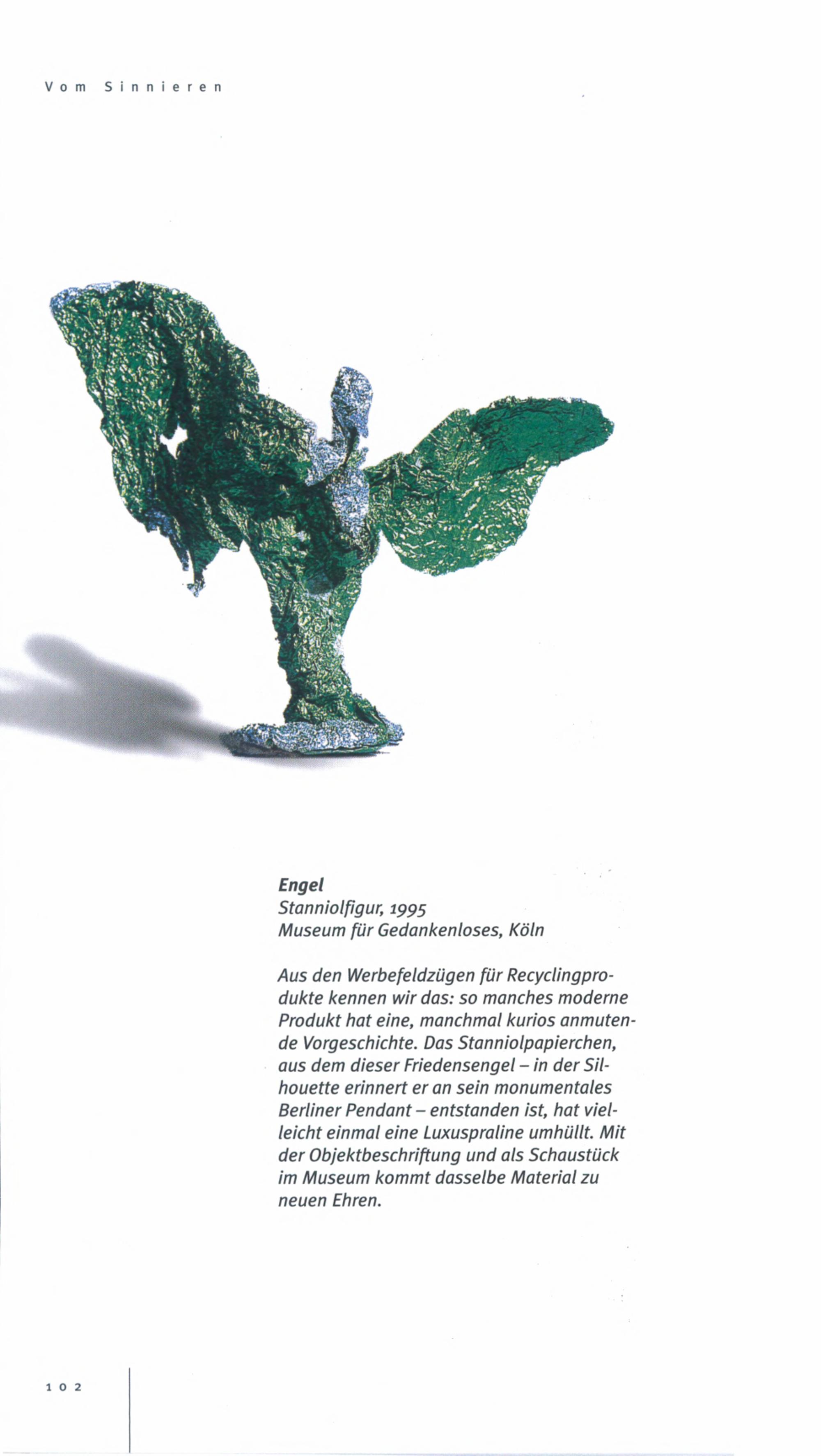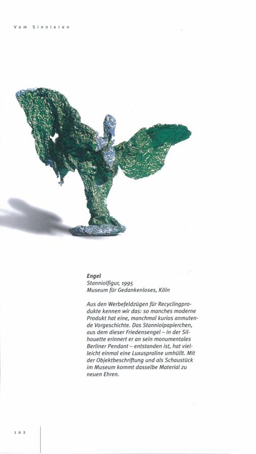 Aus den Werbefeldzügen für Recyclingpro-dukte kennen wir das: so manches moderneProdukt hat eine, manchmal kurios anmuten-de Vorgeschichte. Das Stanniolpapierchen,aus dem dieser Friedensengel- in der Sil-houette erinnert er an sein monumentalesBerliner Pendant- entstanden ist, hat viel-leicht einmal eine Luxuspraline umhüllt. Mitder Objektbeschriftung und als Schaustückim Museum kommt dasselbe Material zuneuen Ehren.