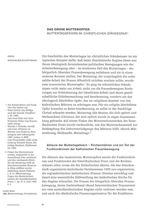 Die Geschichte des Muttertages im> christlichen Ständestaat< ist eintypisches Beispiel dafür, daß( semi-) faschistische Regime Ideen ausihnen ideologisch fernstehenden politischen Bewegungen wie derArbeiterbewegung oder- im konkreten Fall des Muttertages- derbürgerlich- liberalen Frauenbewegung entlehnen und sie in einenanderen Kontext stellen. Der Muttertag, der ursprünglich die unbe-zahlte Arbeit der Frauen öffentlich sichtbar machen sollte, wurdezum inszenierten Mutteropfer.' Es ging im» christlichen Stände-staat«< nicht mehr um Arbeit, nicht um die frauenbewegten Forde-rungen zur Erleichterung der häuslichen Arbeit und deren gesell-schaftliche Sichtbarmachung und Anerkennung, sondern um dasideologisch überhöhte Opfer, das im religiösen Kontext von denkatholischen Müttern zu erbringen war. Für ein religiös überhöhtesOpfer brauchte es keine Anerkennung, es sollte in der NachfolgeChristi erbracht werden. Muttertag( die Mutter, die sich opfert) undWeihnachten( Christus, der sich opfert) wurde in engen Zusammen-hang gebracht. Auf einem Plakat des Mutterschutzwerkes der Vater-ländischen Front wurde verdeutlicht, wie das Mutterschutzwerk zurBekämpfung des Geburtenrückgangs den Müttern hilft:»> durch Müt-terehrung, Weihnacht, Muttertag<<. 2