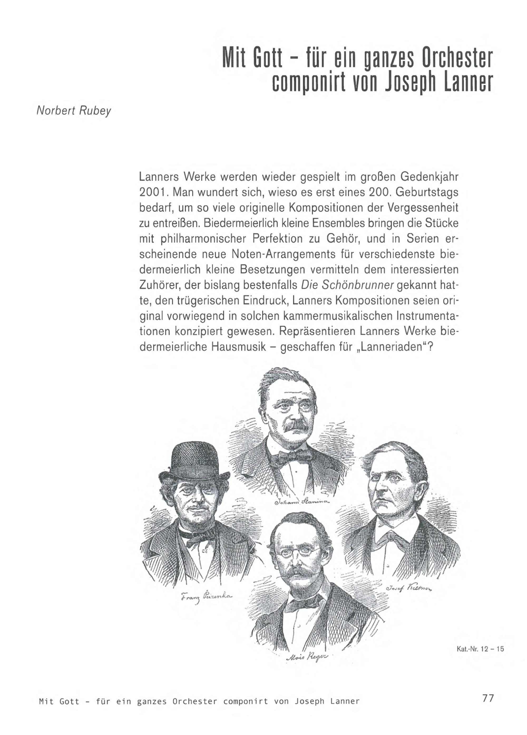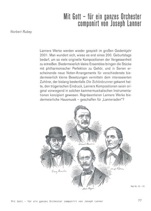 Lanners Werke werden wieder gespielt im großen Gedenkjahr2001. Man wundert sich, wieso es erst eines 200. Geburtstagsbedarf, um so viele originelle Kompositionen der Vergessenheitzu entreißen. Biedermeierlich kleine Ensembles bringen die Stückemit philharmonischer Perfektion zu Gehör, und in Serien er-scheinende neue Noten- Arrangements für verschiedenste bie-dermeierlich kleine Besetzungen vermitteln dem interessiertenZuhörer, der bislang bestenfalls Die Schönbrunner gekannt hat-te, den trügerischen Eindruck, Lanners Kompositionen seien ori-ginal vorwiegend in solchen kammermusikalischen Instrumenta-tionen konzipiert gewesen. Repräsentieren Lanners Werke bie-dermeierliche Hausmusik- geschaffen für„ Lanneriaden“?