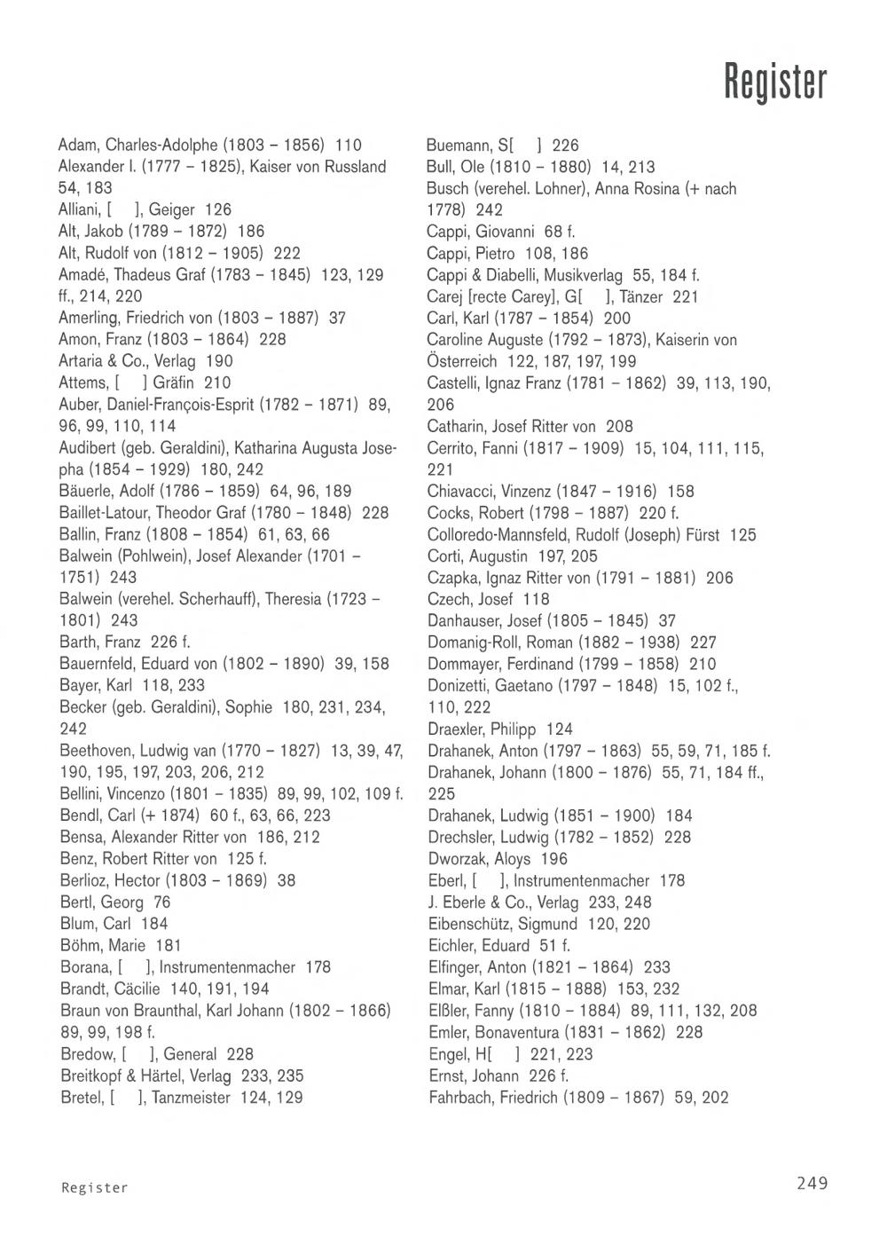 Danhauser, Josef( 1805- 1845) 37Domanig- Roll, Roman( 1882-1938) 227Dommayer, Ferdinand( 1799-1858) 210Donizetti, Gaetano( 1797-1848) 15, 102 f.,110, 222