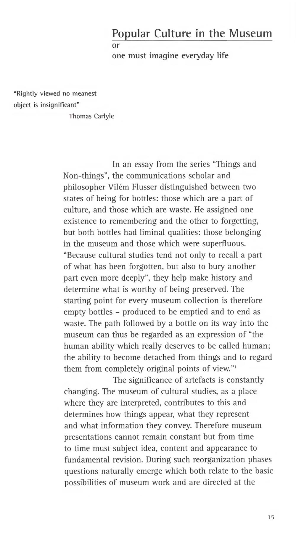 In an essay from the series" Things andNon- things", the communications scholar andphilosopher Vilém Flusser distinguished between twostates of being for bottles: those which are a part ofculture, and those which are waste. He assigned oneexistence to remembering and the other to forgetting,but both bottles had liminal qualities: those belongingin the museum and those which were superfluous." Because cultural studies tend not only to recall a partof what has been forgotten, but also to bury anotherpart even more deeply", they help make history anddetermine what is worthy of being preserved. Thestarting point for every museum collection is thereforeempty bottles produced to be emptied and to end aswaste. The path followed by a bottle on its way into themuseum can thus be regarded as an expression of" thehuman ability which really deserves to be called human;the ability to become detached from things and to regardthem from completely original points of view."