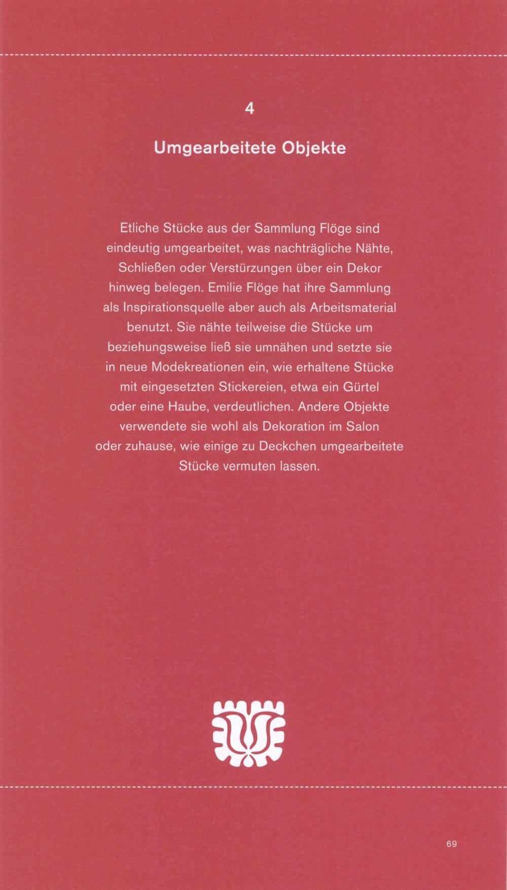 Etliche Stücke aus der Sammlung Flöge sindeindeutig umgearbeitet, was nachträgliche Nähte,Schließen oder Verstürzungen über ein Dekorhinweg belegen. Emilie Flöge hat ihre Sammlungals Inspirationsquelle aber auch als Arbeitsmaterialbenutzt. Sie nähte teilweise die Stücke umbeziehungsweise ließ sie umnähen und setzte siein neue Modekreationen ein, wie erhaltene Stückemit eingesetzten Stickereien, etwa ein Gürteloder eine Haube, verdeutlichen. Andere Objekte