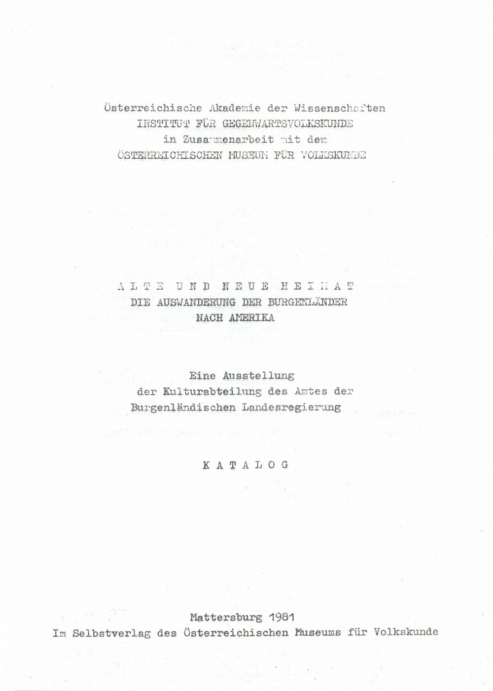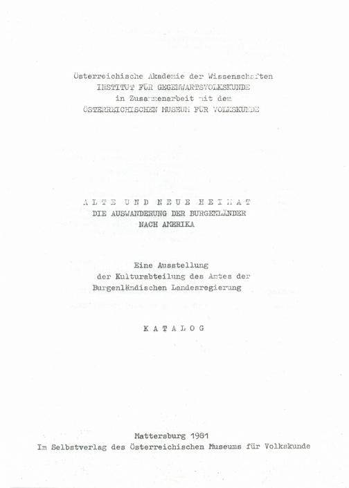 Alte und neue Heimat : die Auswanderung der Burgenländer nach Amerika ; eine Ausstellung der Kulturabteilung des Amtes der Burgenländischen Landesregierung ; Katalog