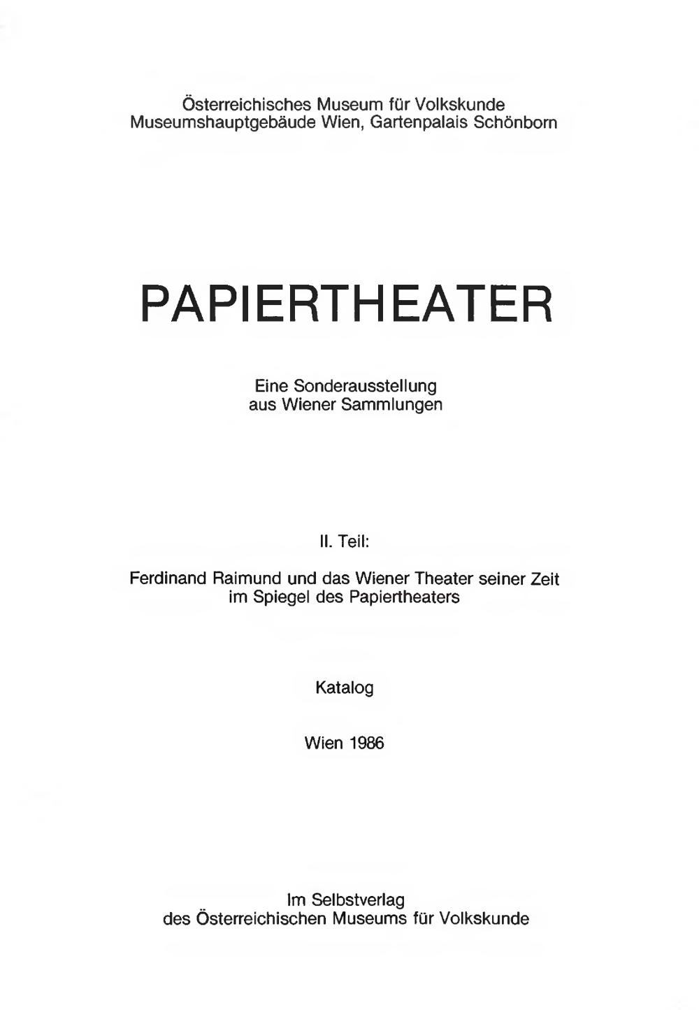 2 (1986) Papiertheater : eine Sonderausstellung aus Wiener Sammlungen. 2 / Ferdinand Raimund und das Wiener Theater seiner Zeit im Spiegel des Papiertheaters