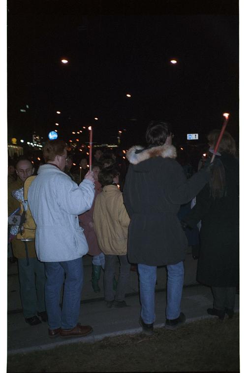 • Teilobjektdig/40298: neg/15177/002: Negativ: Lichtermeer 1993, Demonstrierende mit Fackeln und Kerzen, Wien