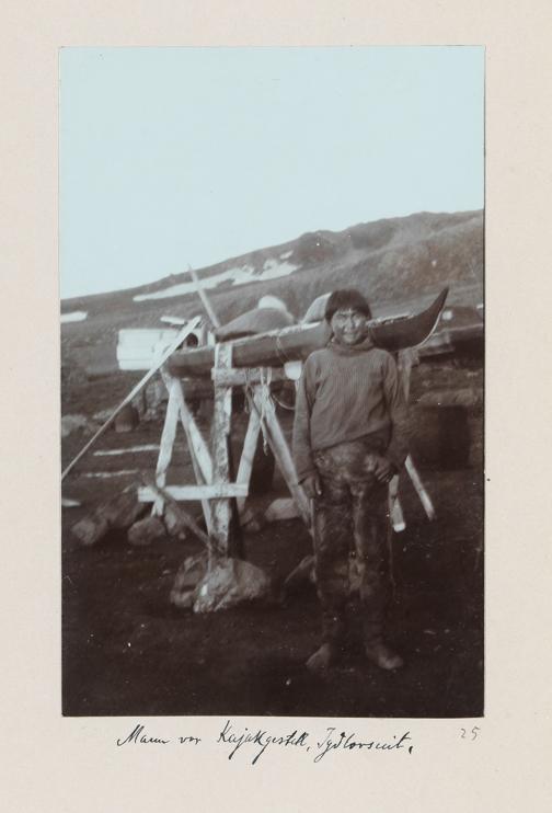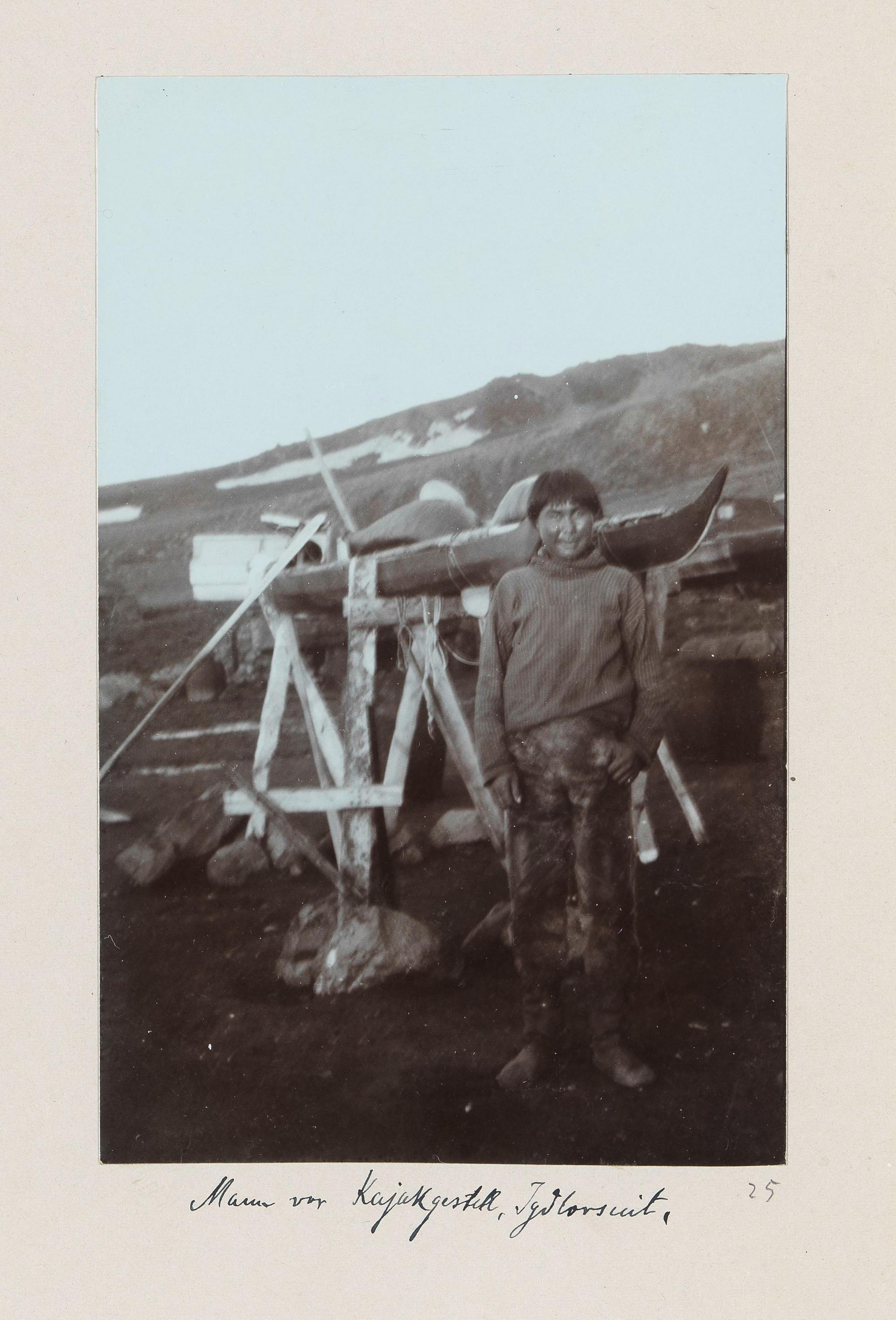 Positiv: Mann vor einem Kajakgestell, IllorsuitVolkskundemuseum Wien / Foto: Birgit&Peter Kainz, faksimile digital
