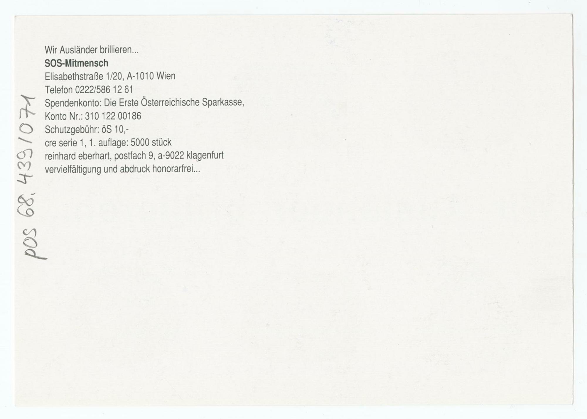pos/68439/71: Ansichtskarte: SOS Mitmensch, RückseiteVolkskundemuseum Wien