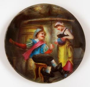 Das Miraculose Gnadenbild Mariæ bründl beÿ denen P.P. Capucinern zwischen Crems und Stein. (Originaltitel)unbekannt (Herstellungsort)Porzellaneinsatz für Bierkrugdeckel: Kellerszene