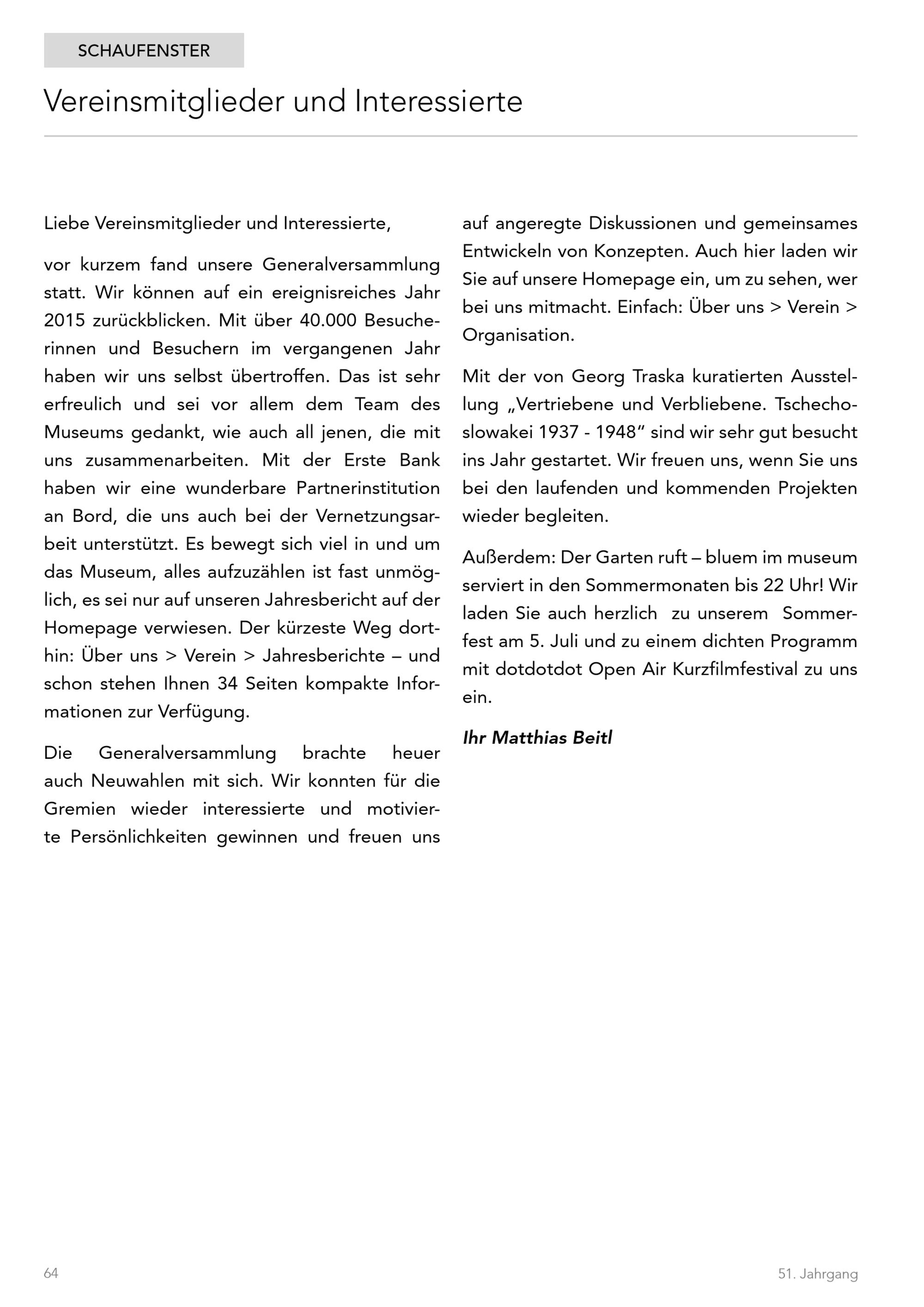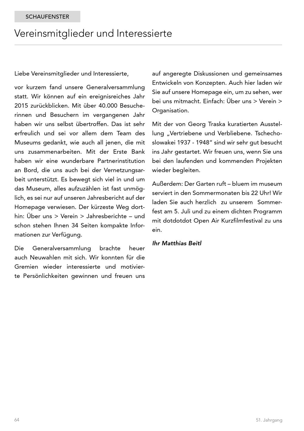 vor kurzem fand unsere Generalversammlungstatt. Wir können auf ein ereignisreiches Jahr2015 zurückblicken. Mit über 40.000 Besuche-rinnen und Besuchern im vergangenen Jahrhaben wir uns selbst übertroffen. Das ist sehrerfreulich und sei vor allem dem Team desMuseums gedankt, wie auch all jenen, die mituns zusammenarbeiten. Mit der Erste Bankhaben wir eine wunderbare Partnerinstitutionan Bord, die uns auch bei der Vernetzungsar-beit unterstützt. Es bewegt sich viel in und umdas Museum, alles aufzuzählen ist fast unmög-lich, es sei nur auf unseren Jahresbericht auf derHomepage verwiesen. Der kürzeste Weg dort-hin: Über uns> Verein> Jahresberichte undschon stehen Ihnen 34 Seiten kompakte Infor-mationen zur Verfügung.