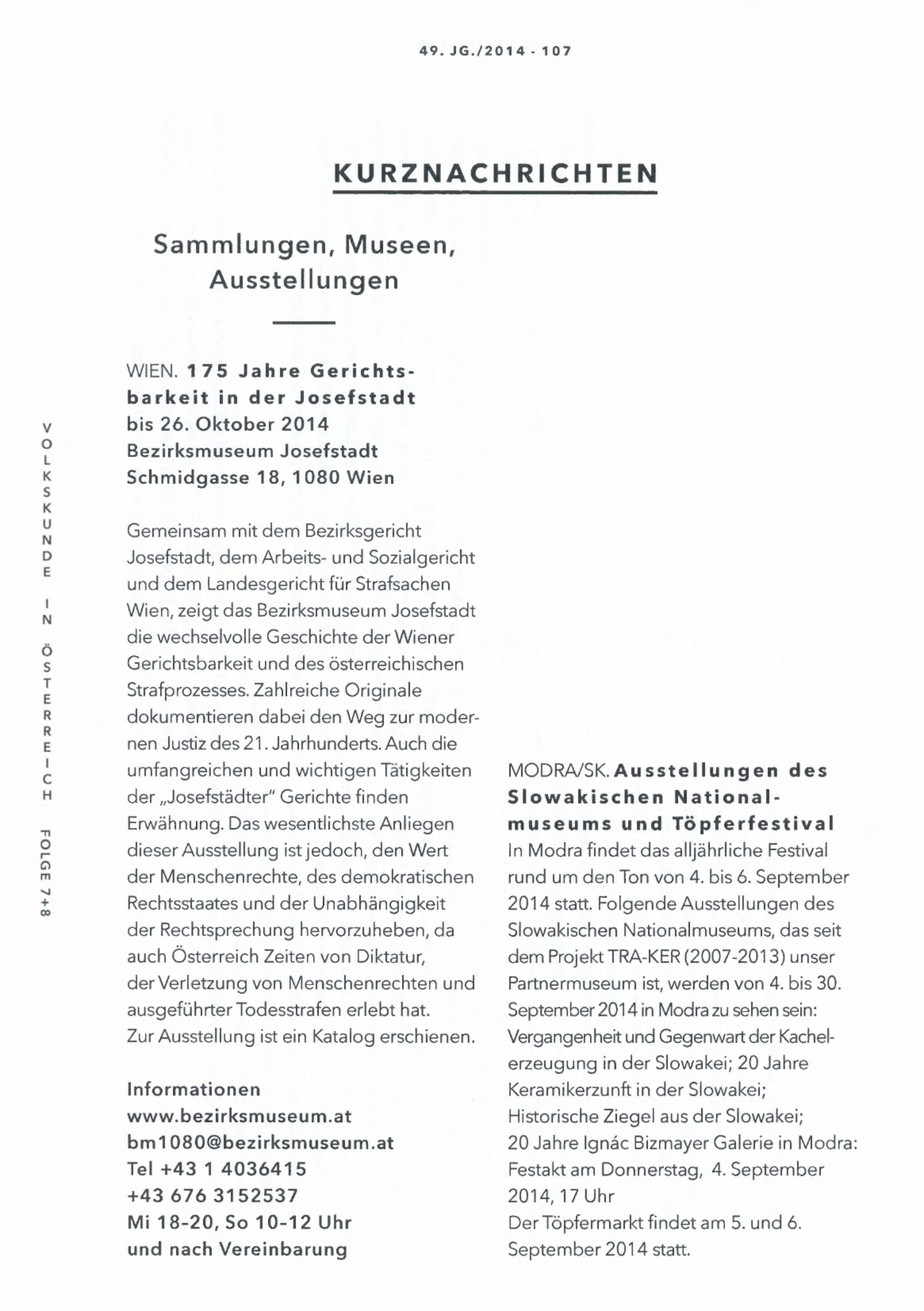 Gemeinsam mit dem BezirksgerichtJosefstadt, dem Arbeits- und Sozialgerichtund dem Landesgericht für StrafsachenWien, zeigt das Bezirksmuseum Josefstadtdie wechselvolle Geschichte der WienerGerichtsbarkeit und des österreichischenStrafprozesses. Zahlreiche Originaledokumentieren dabei den Weg zur moder-nen Justiz des 21. Jahrhunderts. Auch dieumfangreichen und wichtigen Tätigkeitender ,, Josefstädter" Gerichte findenErwähnung. Das wesentlichste Anliegendieser Ausstellung ist jedoch, den Wertder Menschenrechte, des demokratischenRechtsstaates und der Unabhängigkeitder Rechtsprechung hervorzuheben, daauch Österreich Zeiten von Diktatur,der Verletzung von Menschenrechten undausgeführter Todesstrafen erlebt hat.Zur Ausstellung ist ein Katalog erschienen.